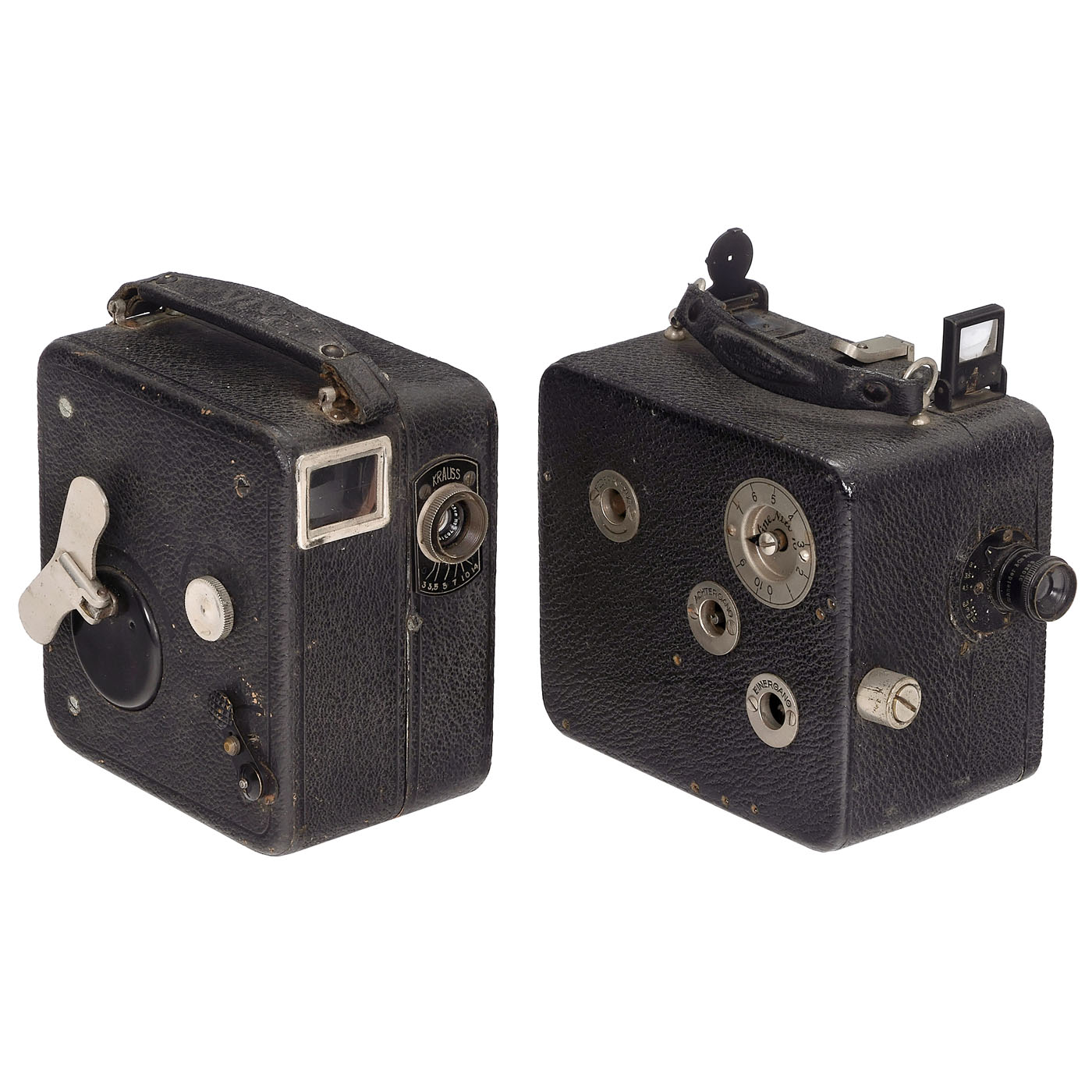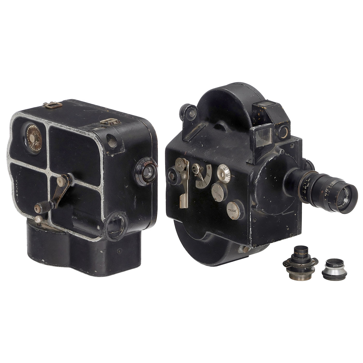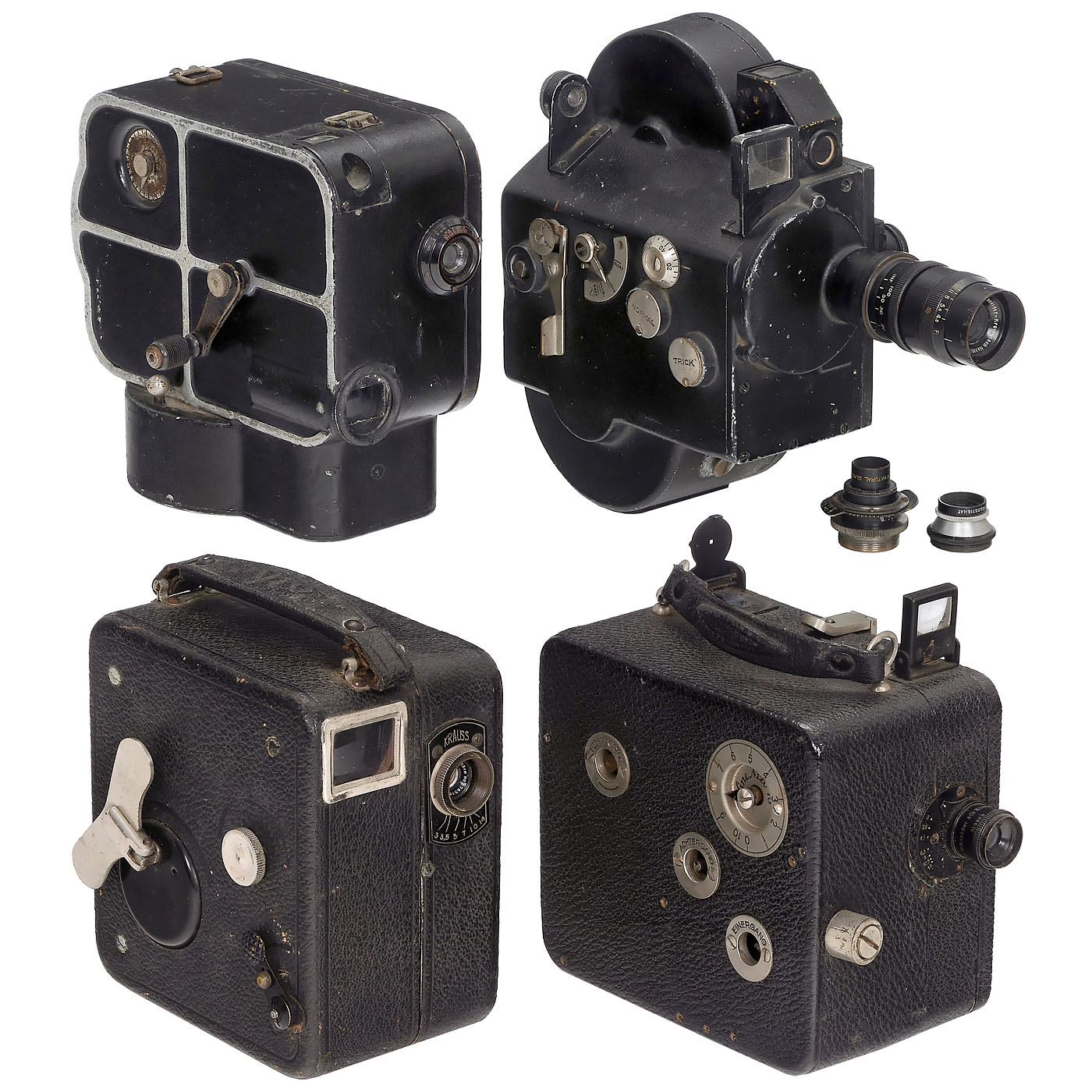 1) Geyer Werke, Berlin. Geyer AK 16, camera for 16mm film on 30m daylight spools in a coaxial arrangement. Lens: Zeiss 2.9/25 mm. Drive: hand crank or via the spring mechanism located under the camera (resin-corroded). The housing includes a Newtonian viewfinder and an angle finder. One of the rarest German narrow-film cameras!