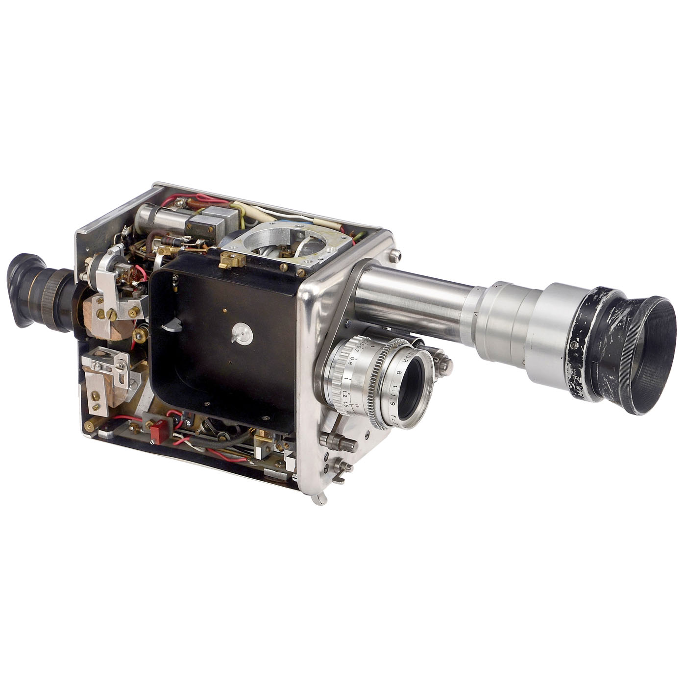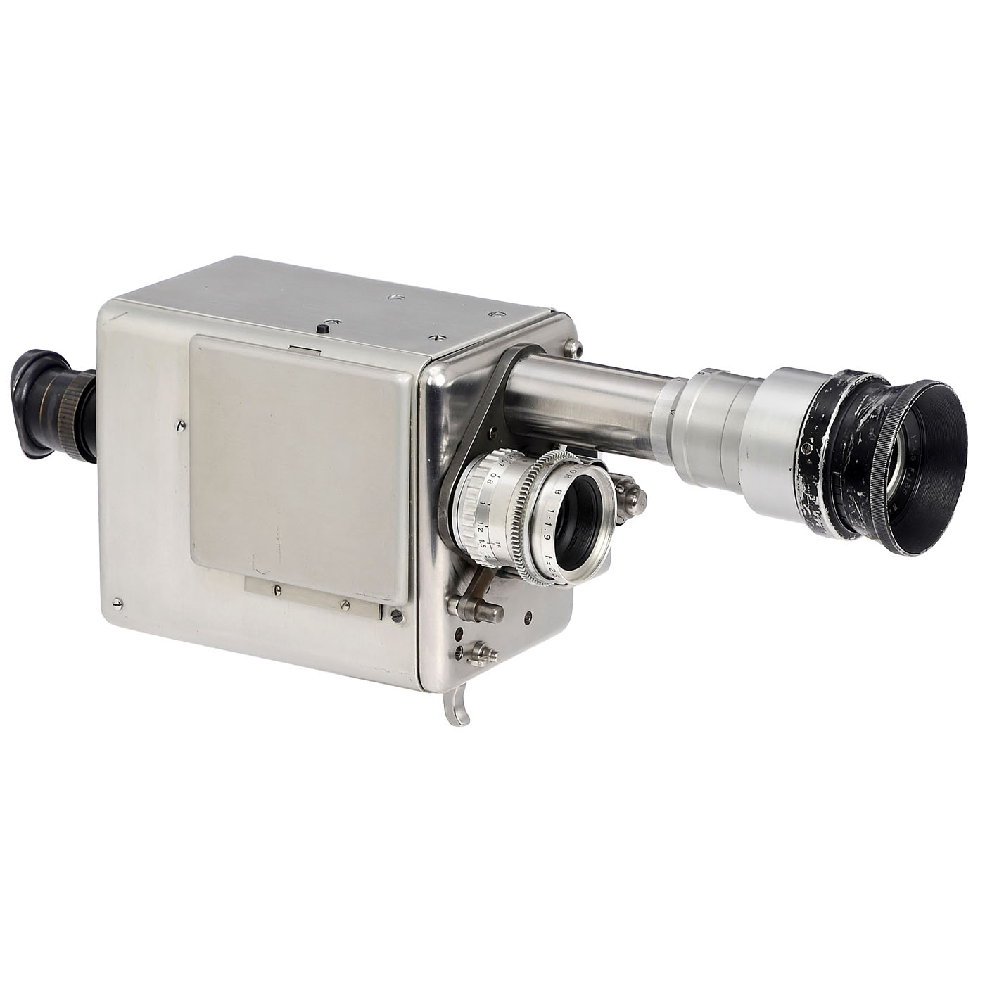 France. No name, 14.5 x 11.7 x 8.5 cm, height with handle 23 cm, custom-made hand-made sample from a film camera manufacturer experimenting with the compartment for the Kodak cassette, presumably to get to know the tolerances (due to the tolerances of the Kodak cassette) for a series production of S-8 cameras. Intended for reflex viewfinders, with Berthiot Cinor 1.9/25 mm and Boyer Saphir B 4.5/75 mm. The sides were removable to allow one to view the inside. Very well preserved, functionality not tested. Good exhibition device to illustrate the production history of film cameras.