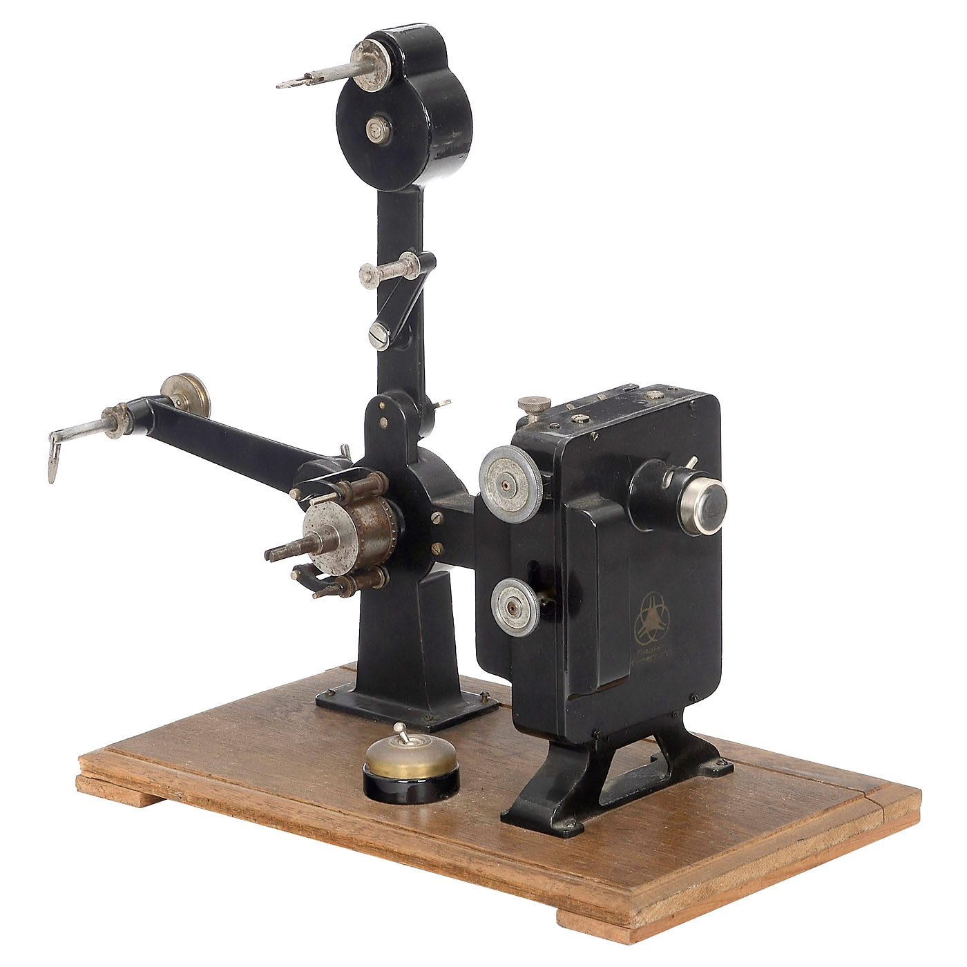 Ernemann, Dresden. 1) Kinox I, film projector for 35mm film on 250m reels (not included). Image shifter with double gripper. Original Ernemann lens. Handcrank drive (not included). Lamp housing for low-voltage bulb, with original transformer.