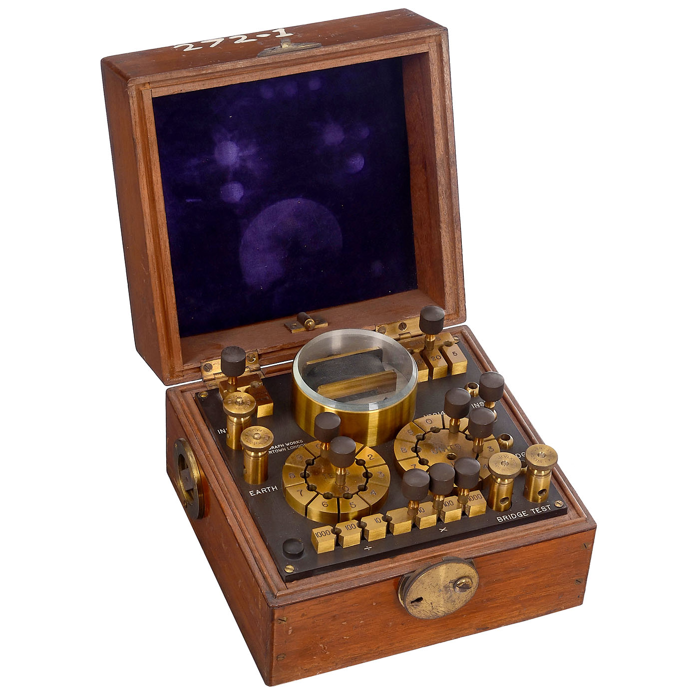 Marked: "Telegraph Works, London". English measuring instrument, originally lacquered brass, with 10 plugs and galvanometer, mahogany box, mint condition.