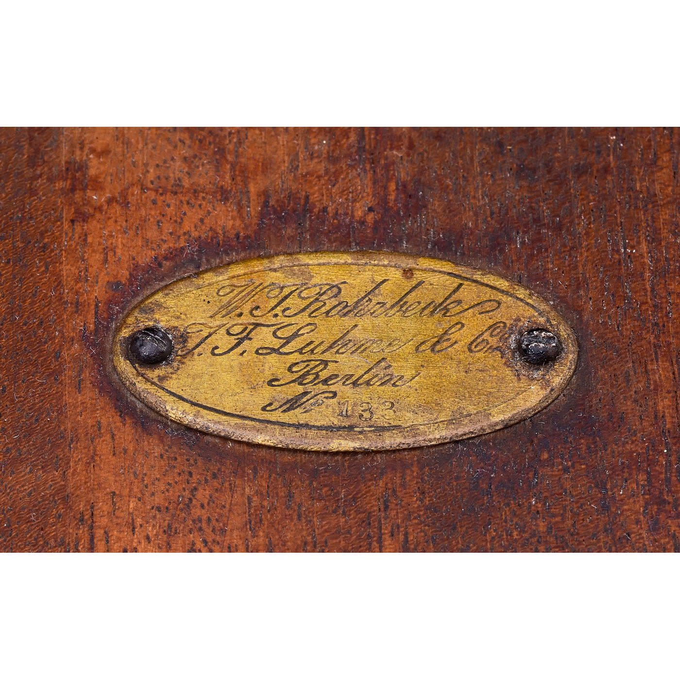 Physical demonstration model by W.J. Rohrbeck, J.F. Luhme & Co. in Berlin, no. 133, a friction machine of the design introduced by Georg Winter, Vienna. Glass plate, ? 15 in., 1 glass pillar headed by one brass sphere, 2 leather-covered and sprung wooden plates, glass column with 1 brass ball and 2 conductors, handle-operated.