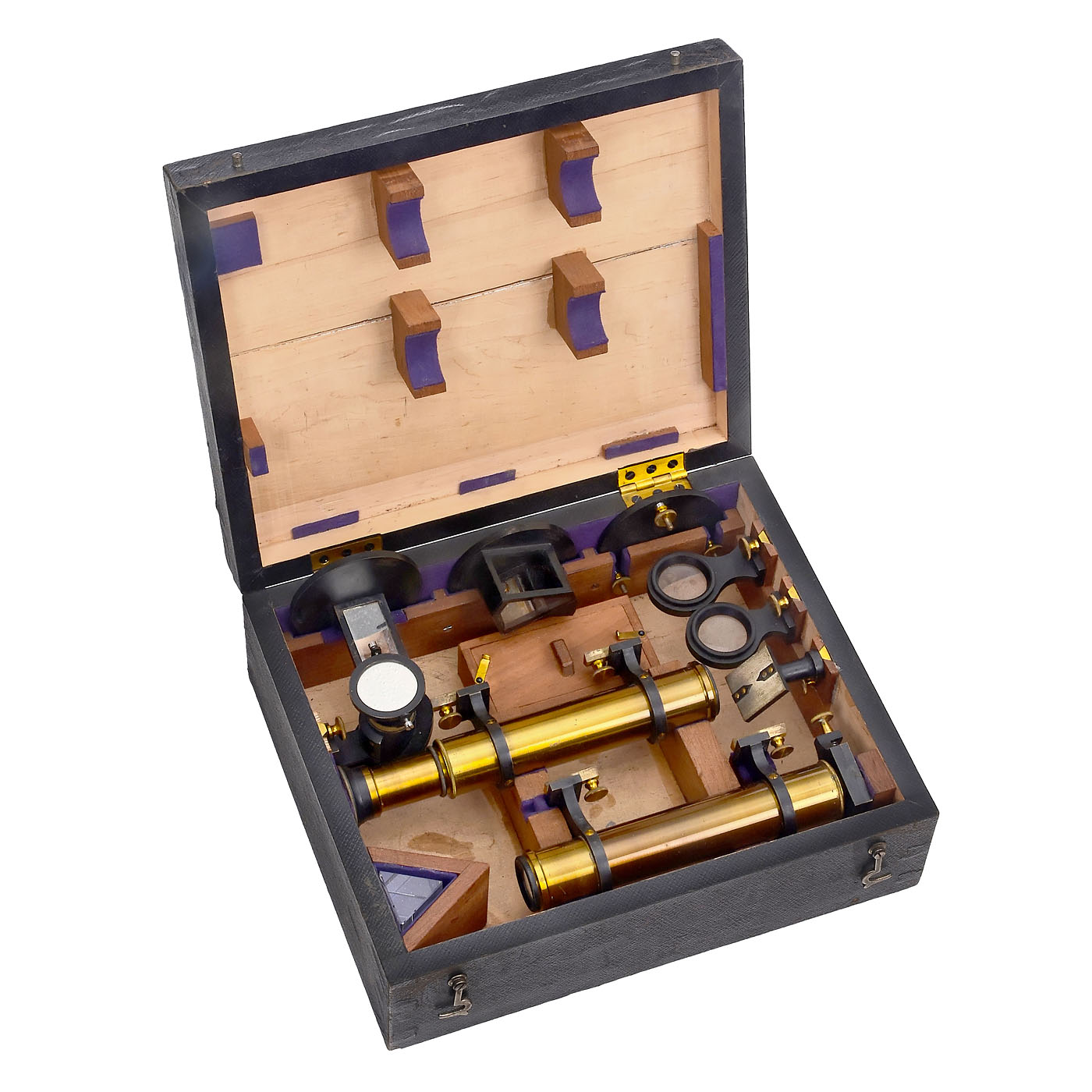 Max Kohl, Chemnitz. The accessories comprise a centering plate for crystals, a plane mirror in mount, a water-vessel in gap, a gap with illumination mirror, two lenses, one collimator tube, one observing telescope, one prism of flint glass and further parts, in elegant box.