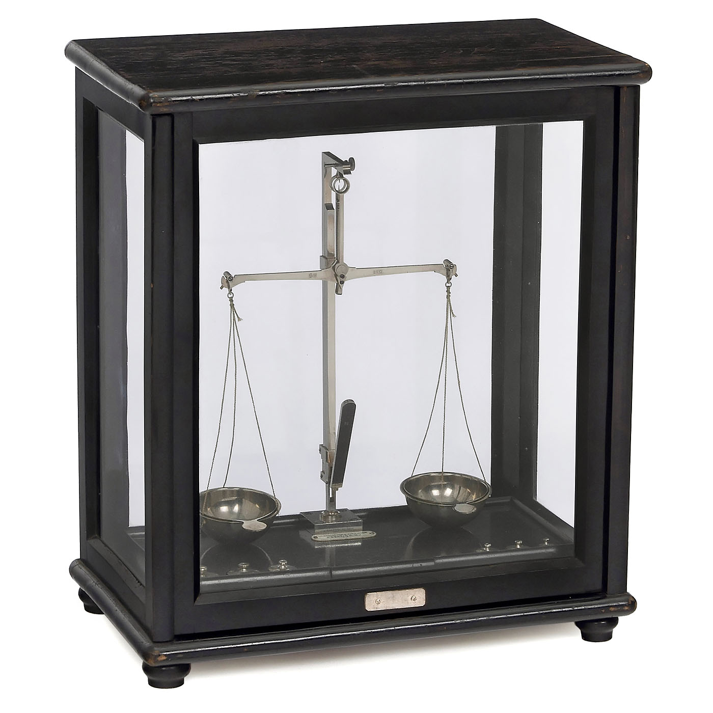 Hagenmeyer & Kirchner, Berlin. Carat scales for jewellers and goldsmiths, with weights between 5 mg and 20 g, nickel-plated mechanism, ebonised case, glazed on four sides, trap door, removable scales with base and small drawer, dimensions 11 ? x 7 x 13 1/3 in.