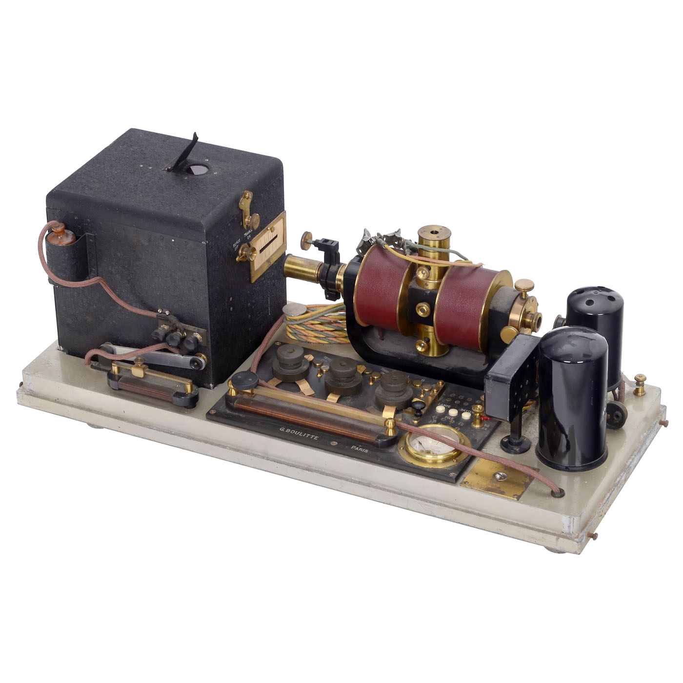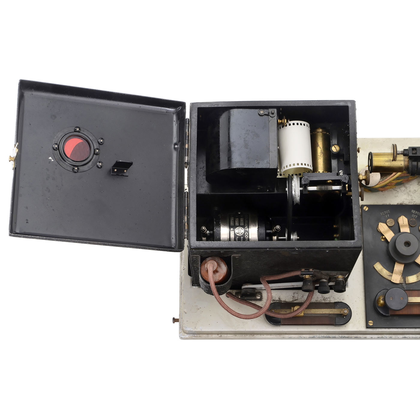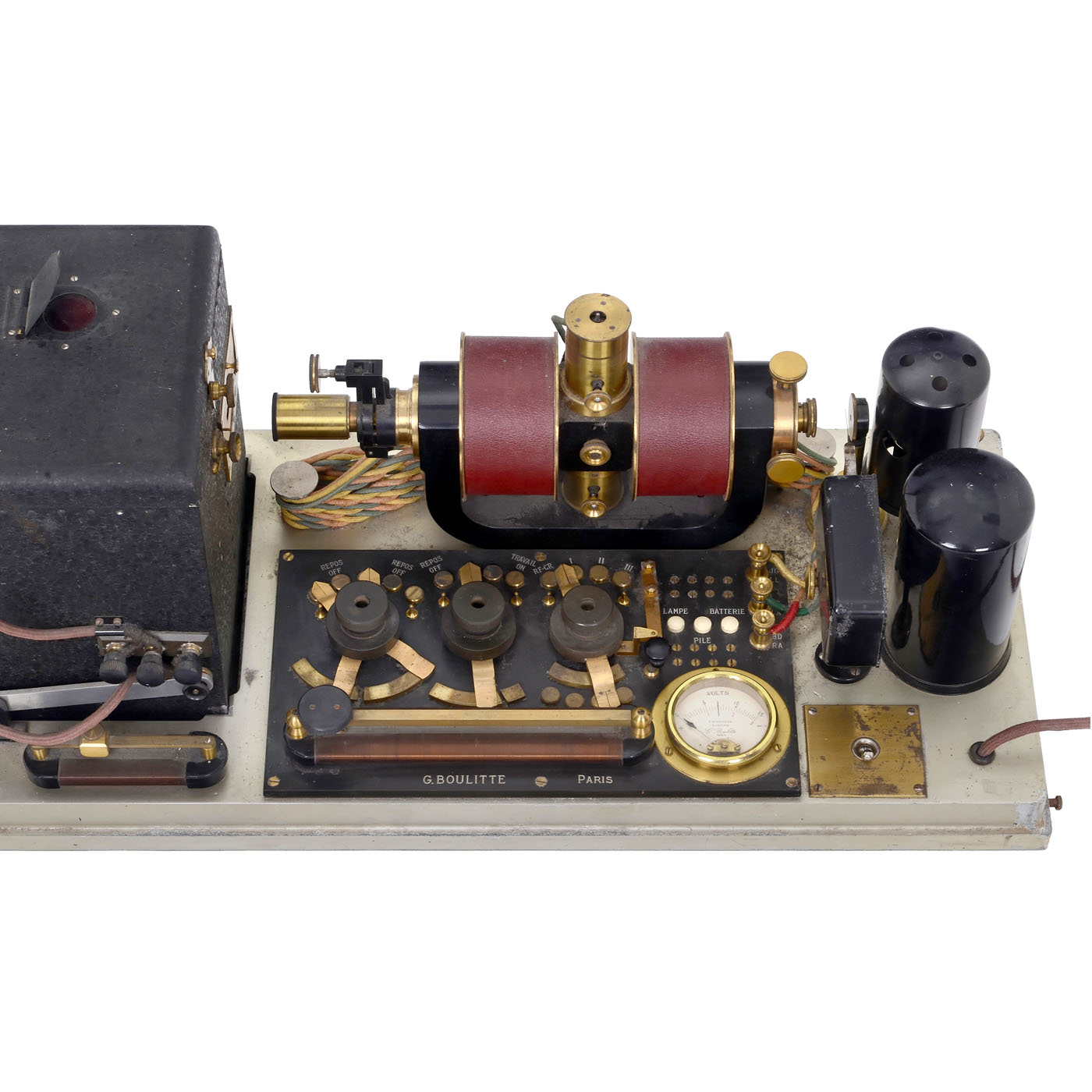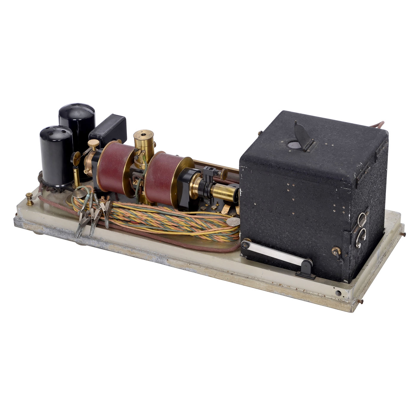 Patent by Georges Charles Boulitte BF 653690, 2 May 1928, improvements to a galvanometer, in particular for electrocardiography, consisting of: 60mm film in cassette, driven by electric motor, two speeds, two rheostats, an electrocardiograph and galvanometer with projection system, motor switch and galvanometer switch, on metal base, 67 x 27 cm.