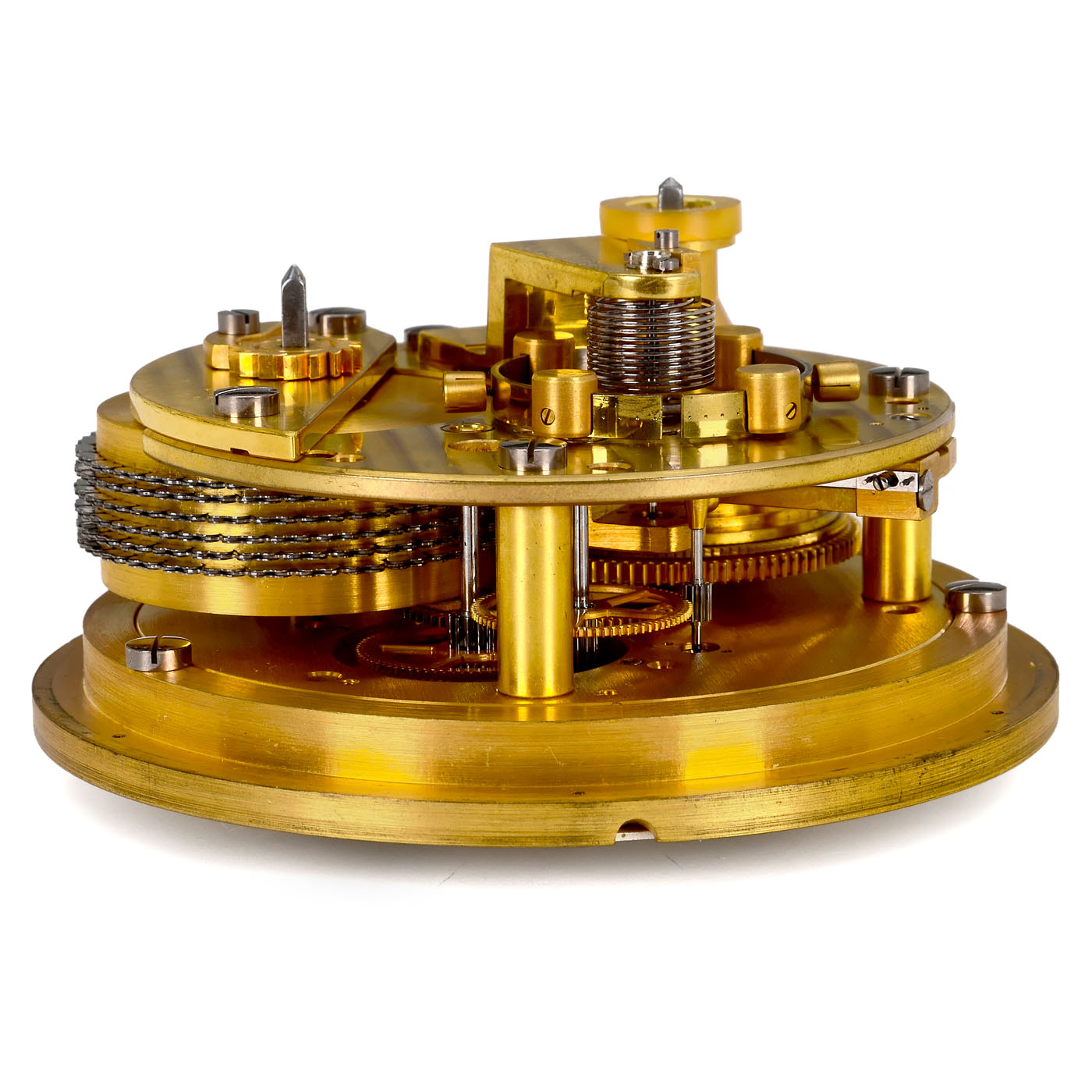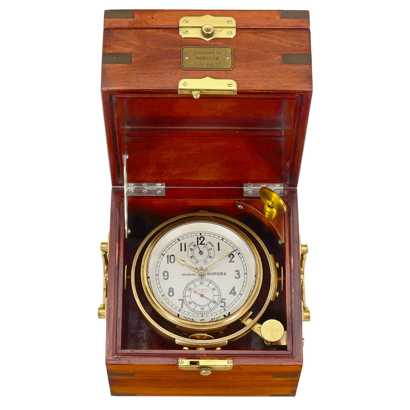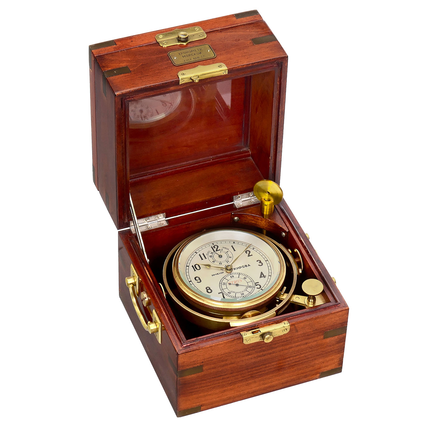 First Moscow Clock Factory Kirova. No. 27203, with fusee movement, subsidiary hand for 1/2 seconds, power reserve indicator for 56 hours, two-part mahogany wood case with glass pane and gimbaled brass mount, working well, with key. This clock was modeled on the Lange standard chronometer by Glash