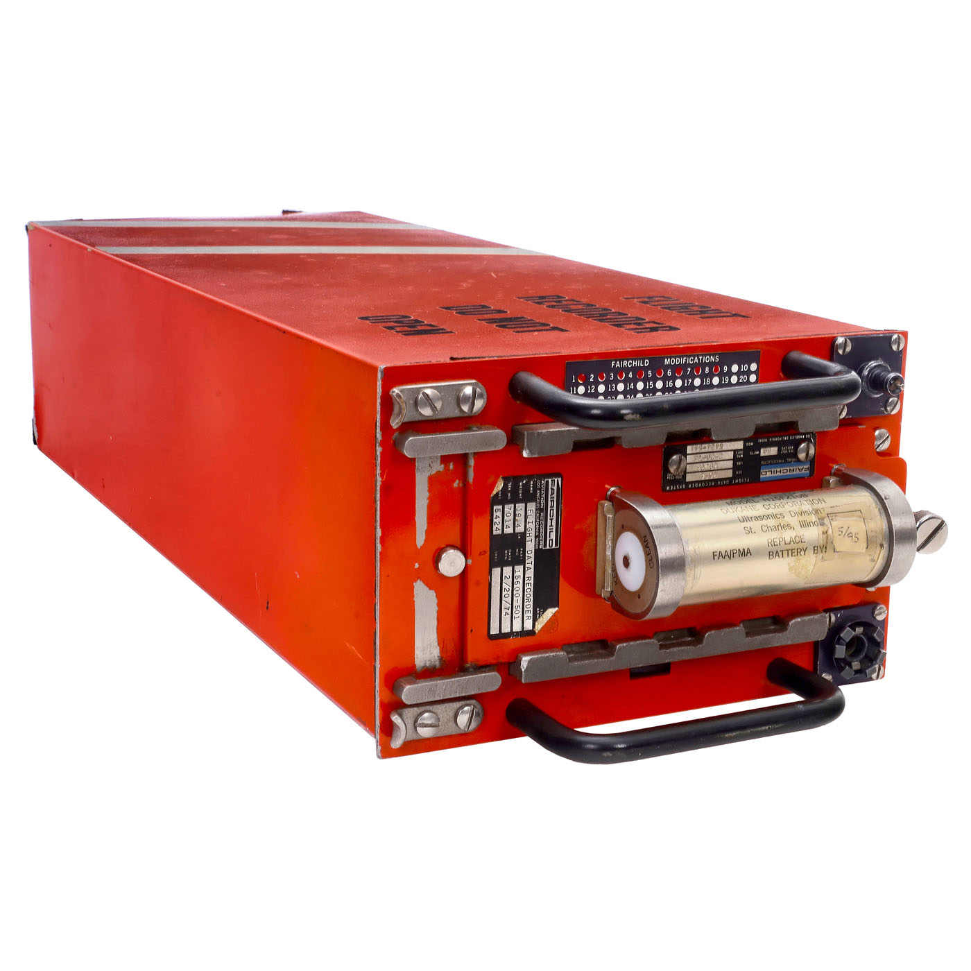 American black box, for recording technical data, used in civil aviation, mostly in Boeing aircrafts, in the typical orange livery, 22 x 8 x 5 in.