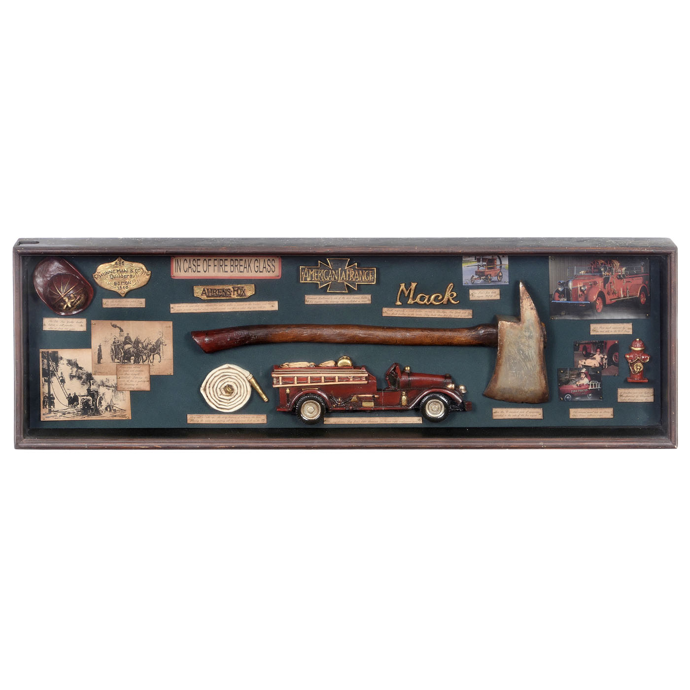Modern miniatures, with hose, hydrant, helmet, medals, ?re engine and other parts, all labeled, in glazed case, dimensions 13 x 41 1/3 x 3 1/2 in.