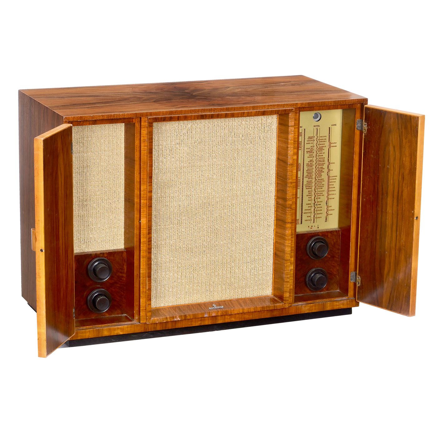 Siemens & Halske, Berlin. 7 tubes, long wave, medium wave and short wave, 110, 125, 150, 220 and 240 volts AC, 2 built-in dynamic loudspeakers (tweeter and woofer), wood case with 2 doors in front of the dial and the control knobs, width 25 3/5 in., complete with tubes and rear panel, very good condition, functional according to previous owner.