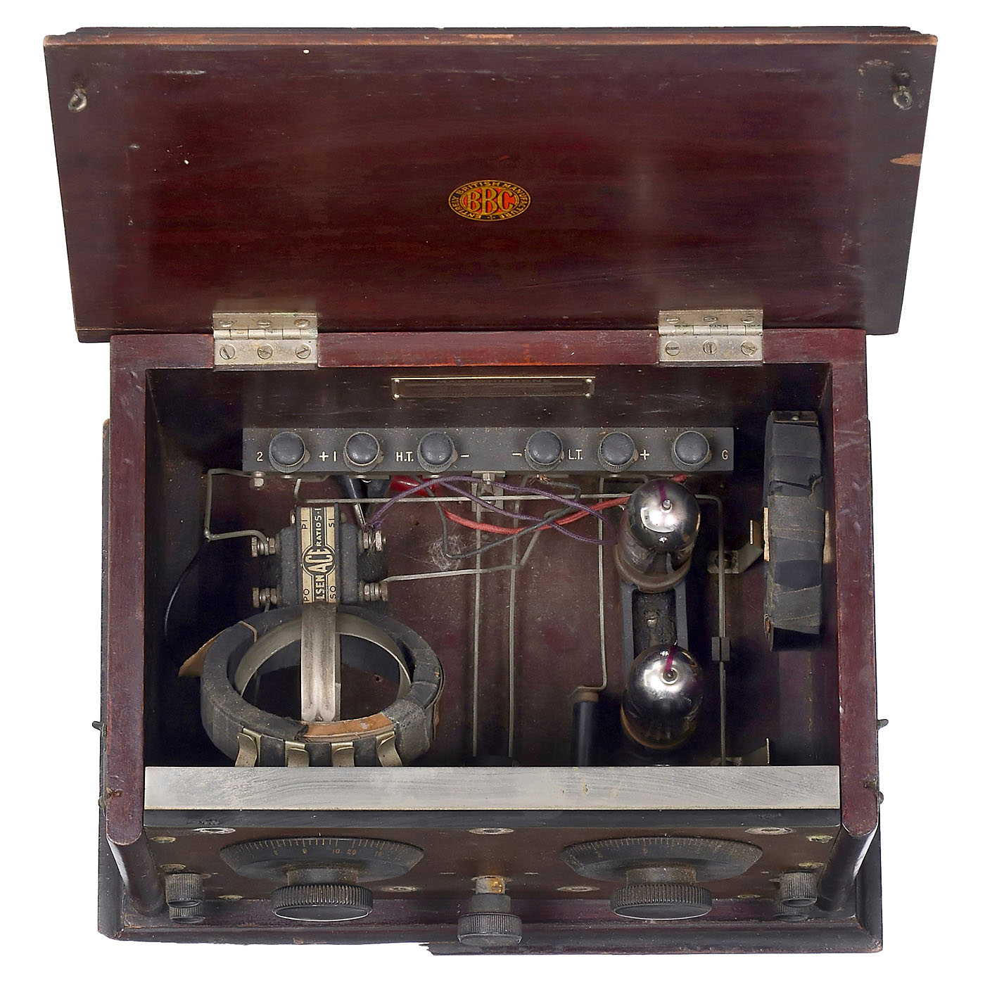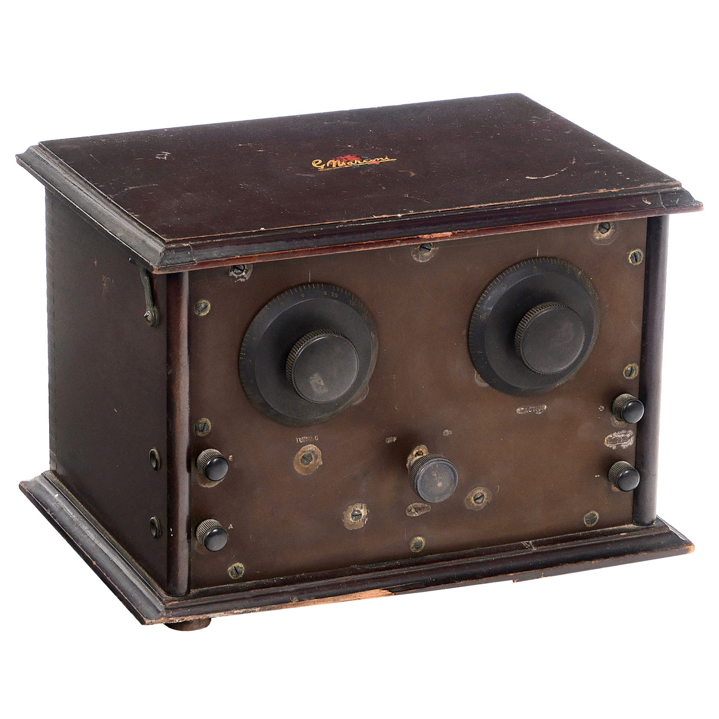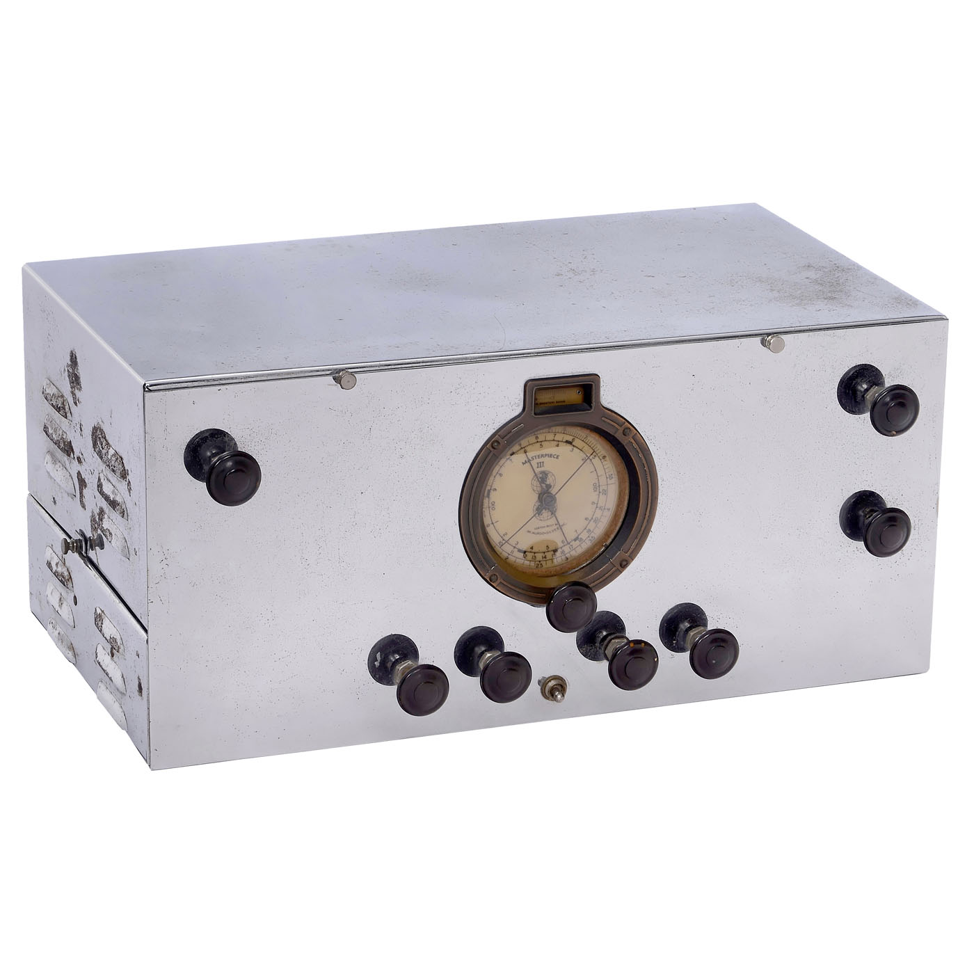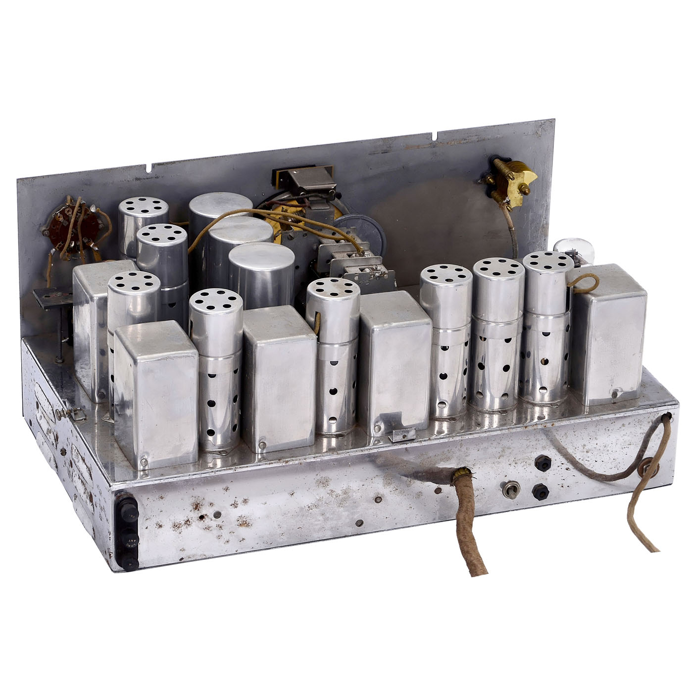 1) McMurdo Silver Masterpiece III, 1934, McMurdo Silver, Inc., USA. 12 tubes, frequency range 520 kHz to 23 MHz, medium wave and several short-wave ranges, for external power supply, chrome-plated case, same circuit as the Masterpiece II, it used a 2A5 first audio which fed two 2A5's audio output. Tapped volume control discontinued and a separate "tone" control added. The separate tuning dial is missing and the main tuning gang is controlled by a vernier-drive "airplane-dial" system.