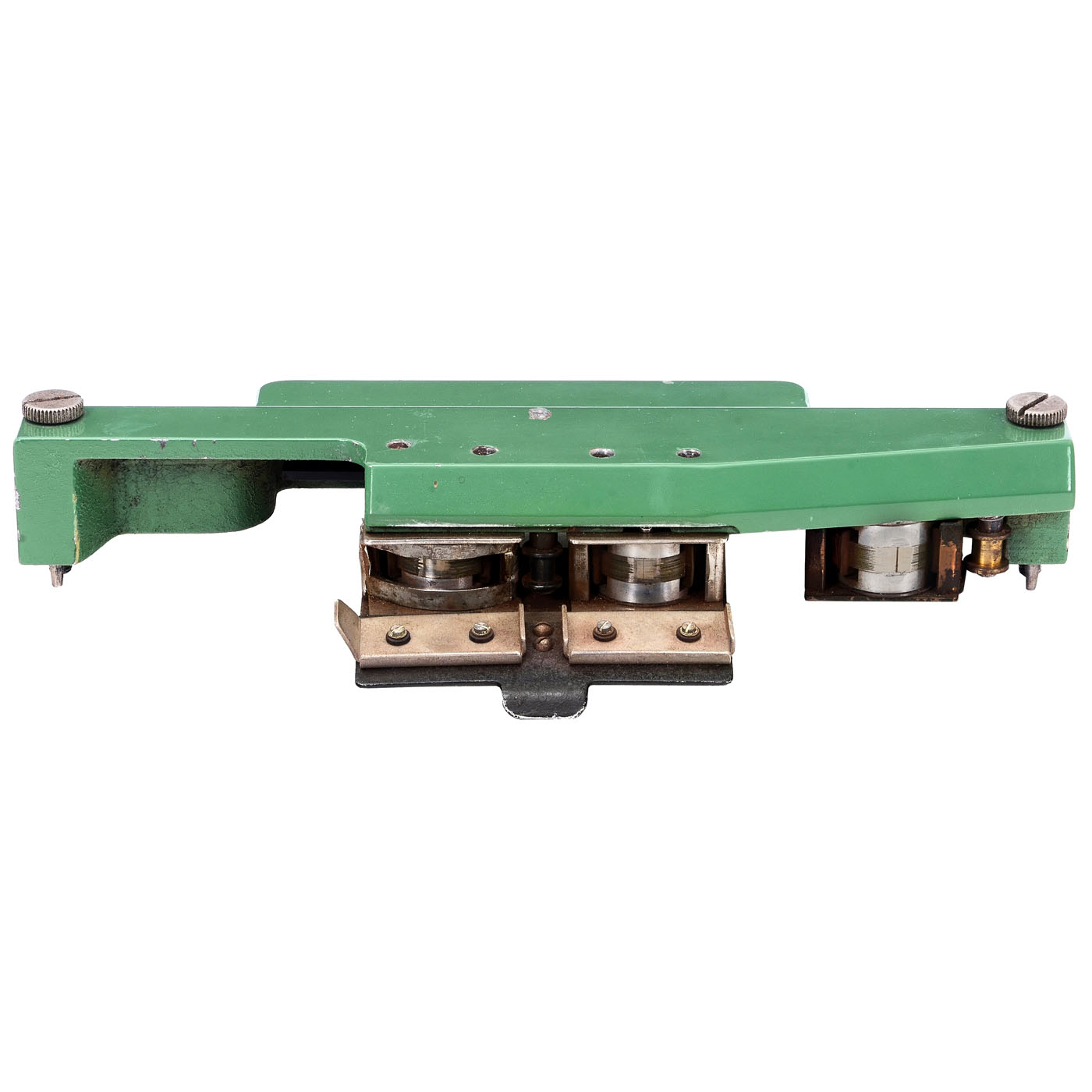 The world's first mass-produced tape recorder for the newly developed BASF plastic audio tapes, portable unit, reel disc with clamp mount, tape speed 76 cm/s, three-motor drive, interchangeable head support with three fixed magnetic heads (erasing head, speaking head and listening head), 220-volt AC power supply, separate amplifier, with indicator lights, level indicator, inputs for radio and microphone, sound and volume controls and control loudspeaker.