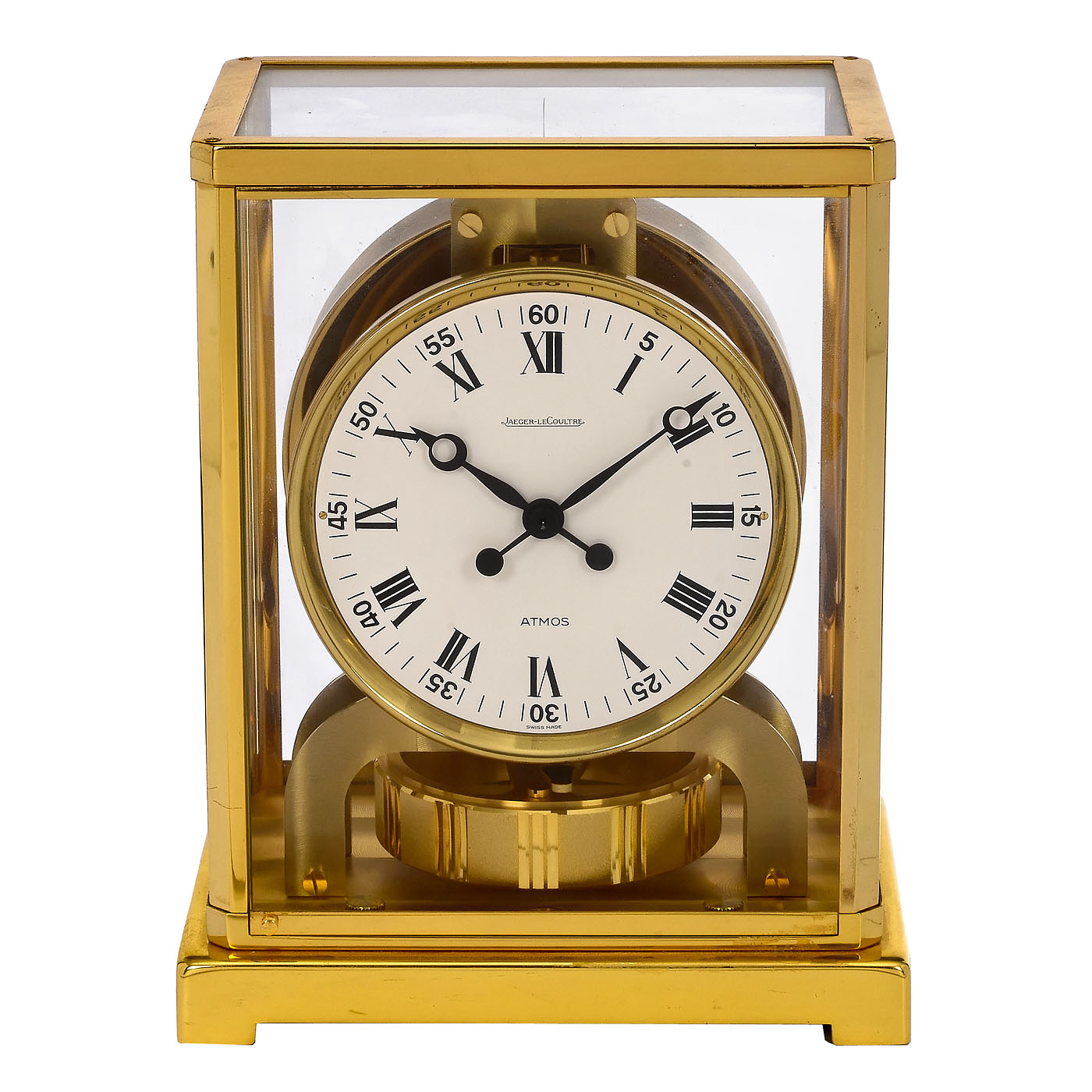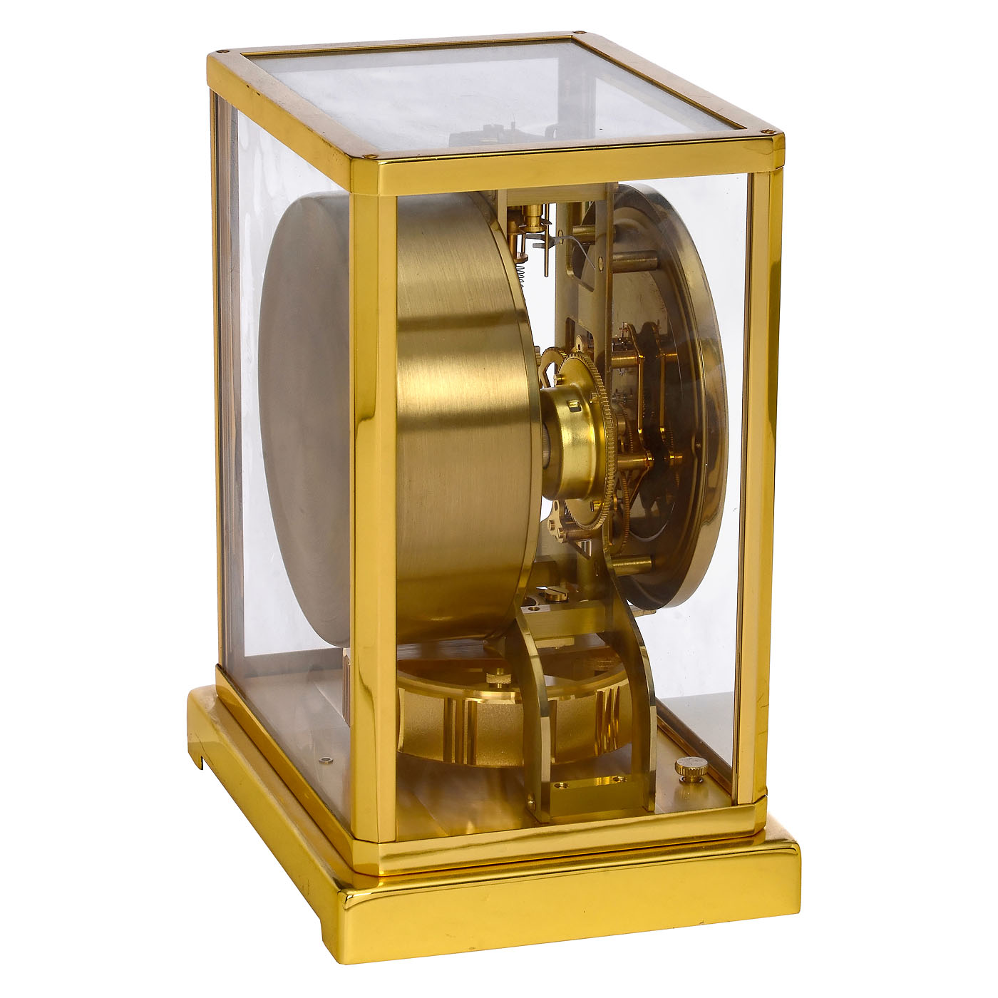 Swiss table clock, caliber 526, no. 294504, gold-plated brass case, 5 glazed sides, front door, white dial with Roman numerals, torsion pendulum, locking lever under the dial, automatic winding by temperature change, very good condition, working, without guarantee of duration and accuracy, height 8 ? in. With original sales box.