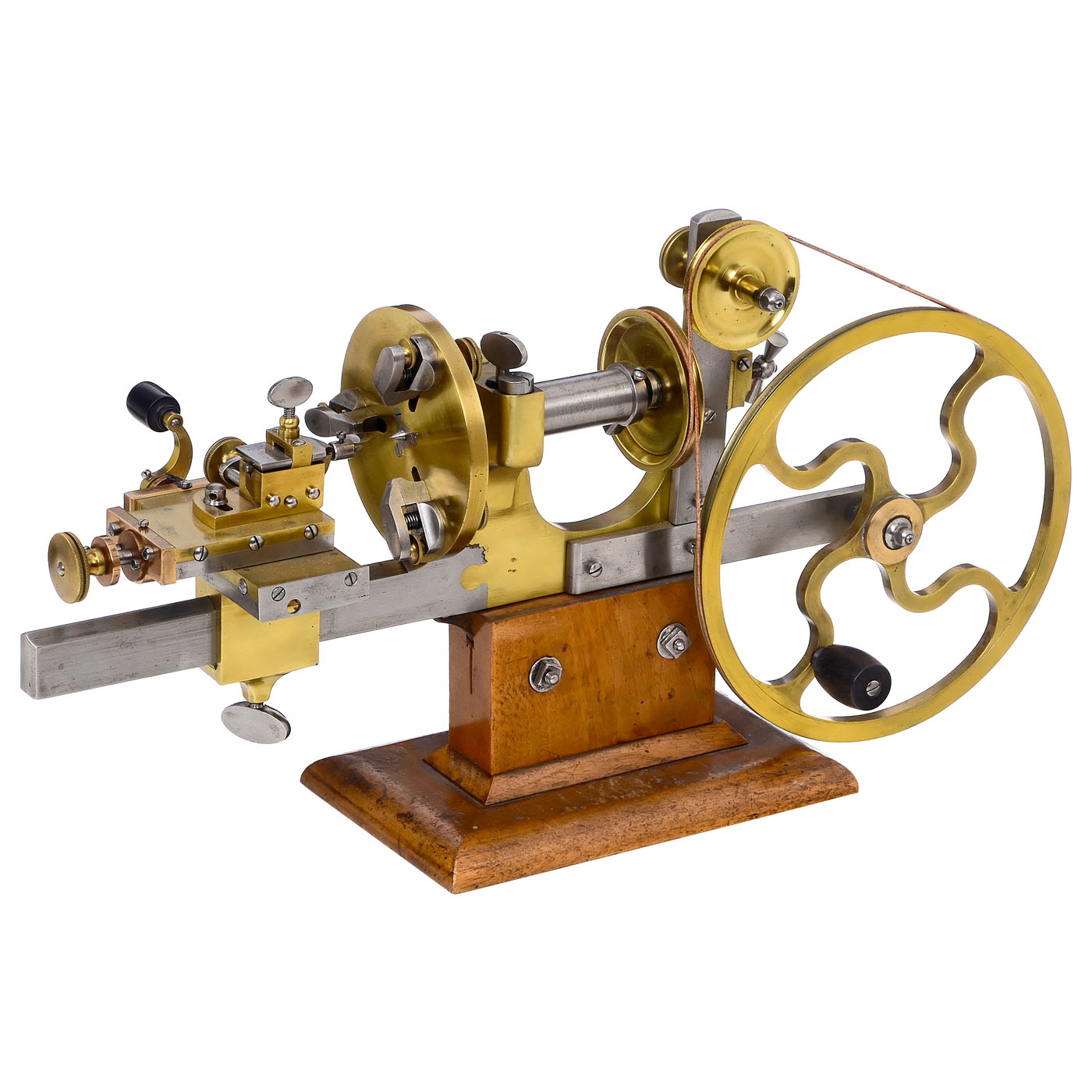 Precision horological tool (also known as a "Burin fixe"), 4 ? in. three-jaw chuck, brass and steel on walnut base, belt-driven, with 9 in. flywheel, total length 22 ? in., very good working restored condition.