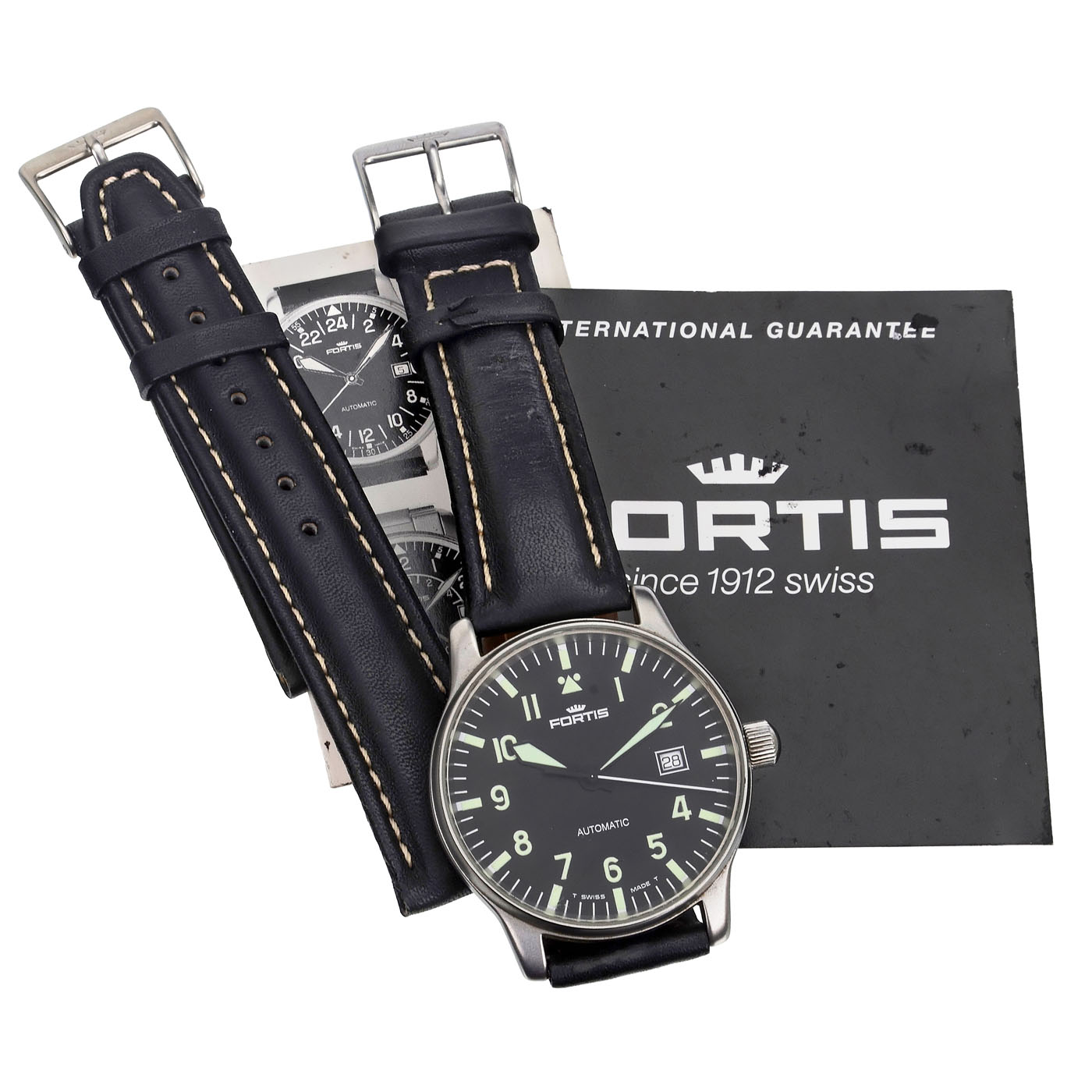 Stainless steel men's watch, ref 595.10.40, screwed back, sapphire crystal, water resistant to 10 atm, automatic, hours, minutes, seconds and date, black dial, luminous hands and luminous markings, leather bracelet, case diameter 1 ? in., height 2/5 in., working, with German short instructions, guarantee card from 1999 and additional new Fortis leather bracelet.