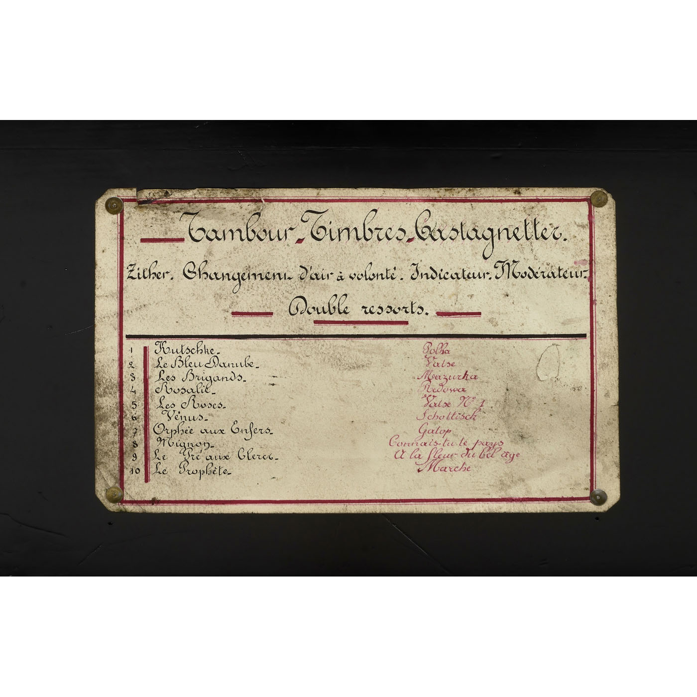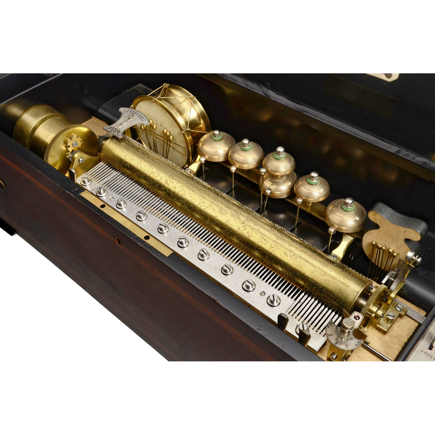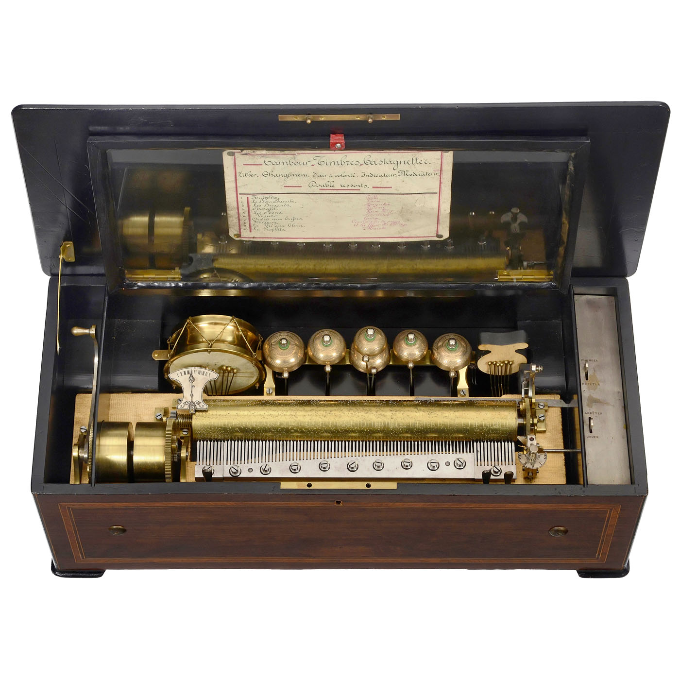 Playing ten airs including "The Blue Danube" by Johann Strauss and "Cancan" from the operetta "Orpheus in the Underworld" by Jacques Offenbach, with 72 teeth in the musical and 20 teeth in the percussion combs (all complete) accompanied by drum, six engine-turned saucer bells and castanet, with manuscript tune sheet, double-spring motor, tune-indicator, tune-selector and adjustable speed control, in crossbanded veneered case with marquetry lid motif of an anthropomorphic monkey as showman with magic lantern and barrel organ, wd. 30 in. (76 cm), cylinder 16 ? in. (41 cm), two bells in need of adjustment, otherwise in good restored and playing condition.