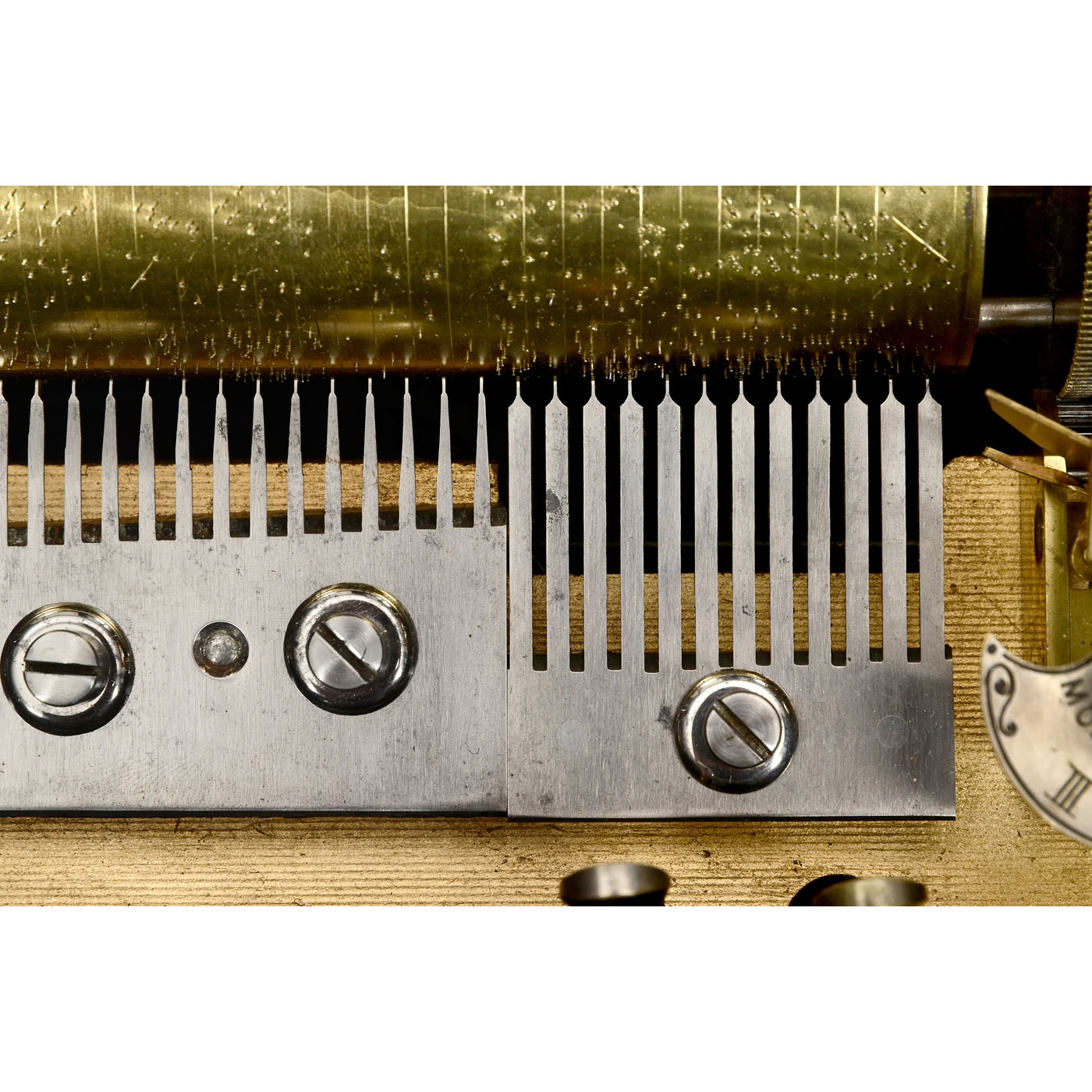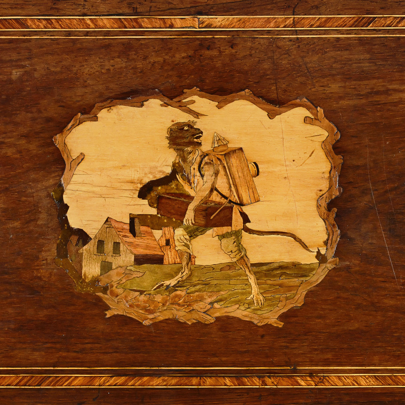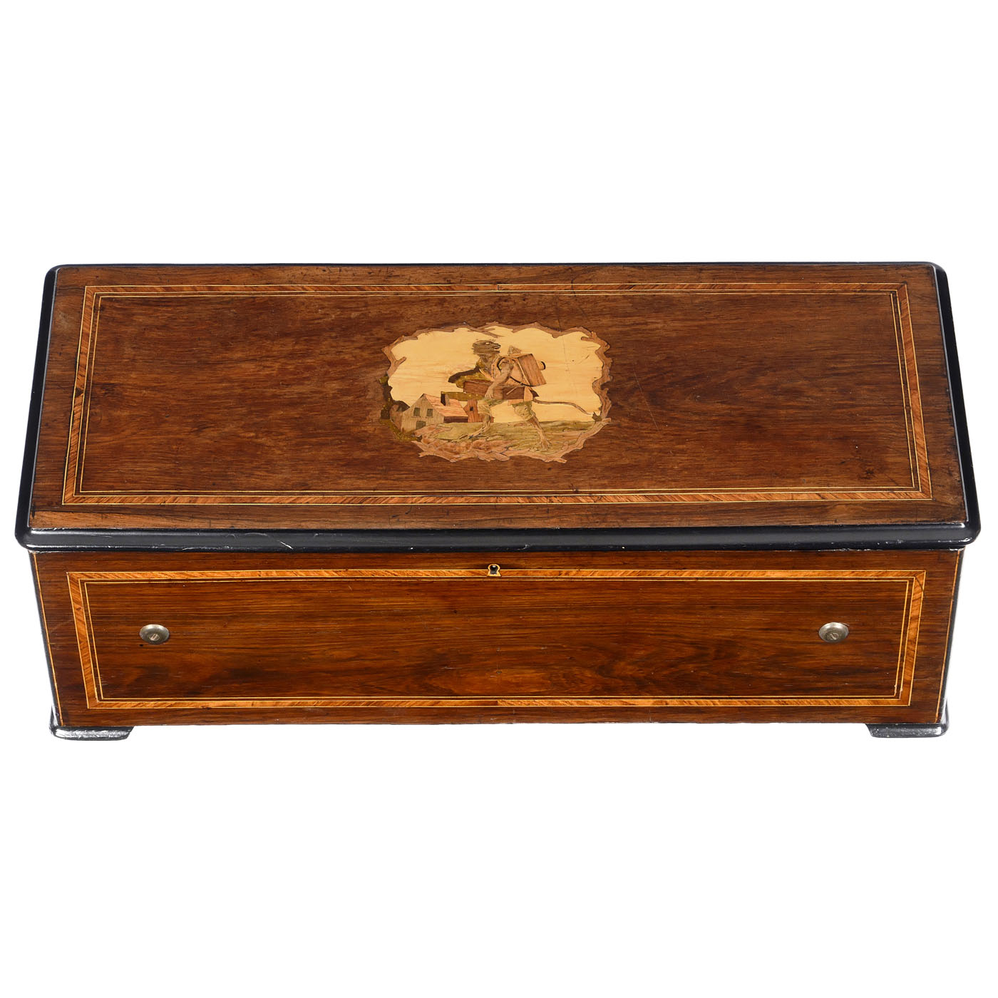 Playing ten airs including "The Blue Danube" by Johann Strauss and "Cancan" from the operetta "Orpheus in the Underworld" by Jacques Offenbach, with 72 teeth in the musical and 20 teeth in the percussion combs (all complete) accompanied by drum, six engine-turned saucer bells and castanet, with manuscript tune sheet, double-spring motor, tune-indicator, tune-selector and adjustable speed control, in crossbanded veneered case with marquetry lid motif of an anthropomorphic monkey as showman with magic lantern and barrel organ, wd. 30 in. (76 cm), cylinder 16 ? in. (41 cm), two bells in need of adjustment, otherwise in good restored and playing condition.