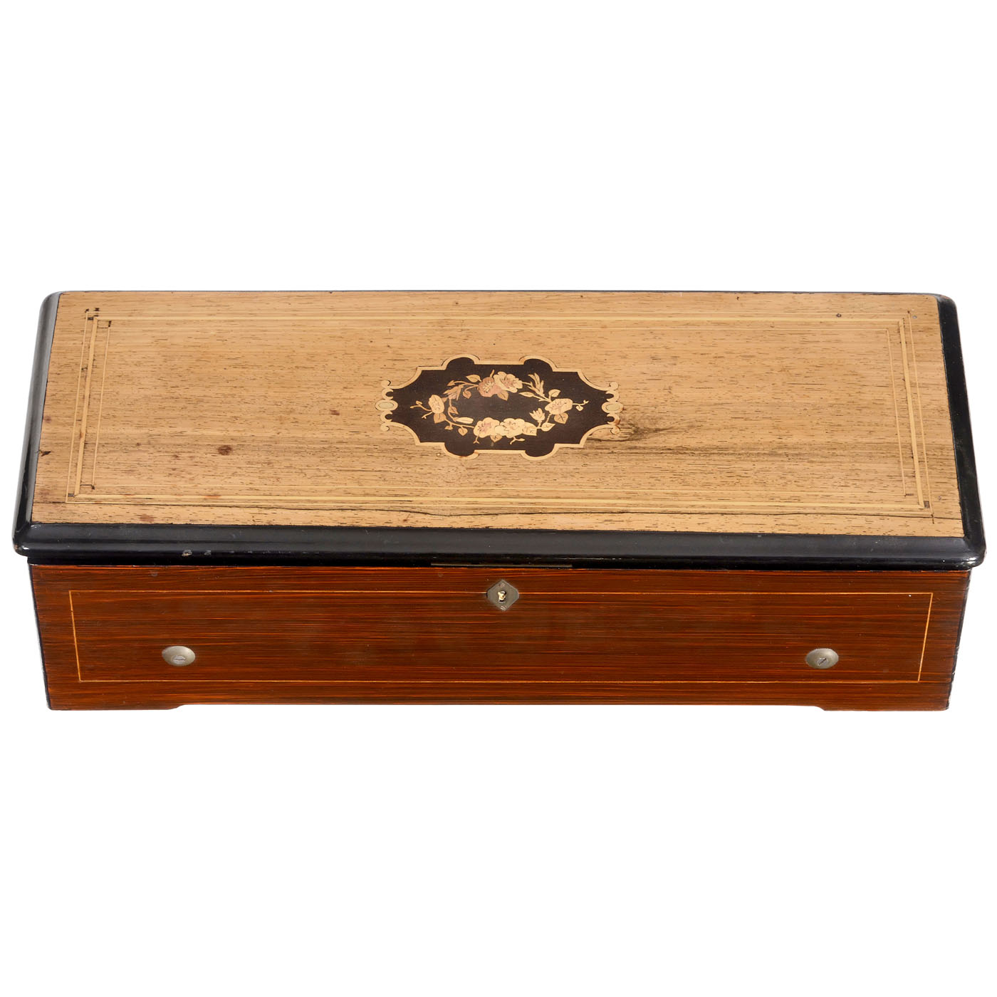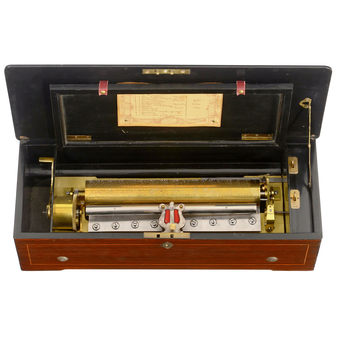 No. 1971, playing twelve popular airs including "God Save the Queen", with 123 alternate sounding and non-sounding teeth in steel comb (extreme bass tooth with defective tip), zither attachment, flat-topped winding lever, tune-change cam with numbered projections, tune-sheet, grained case and faded veneered and inlaid lid, good restored playing condition, with full tone, wd. 22?? in. (58 cm), cylinder 13 in. (33 cm).