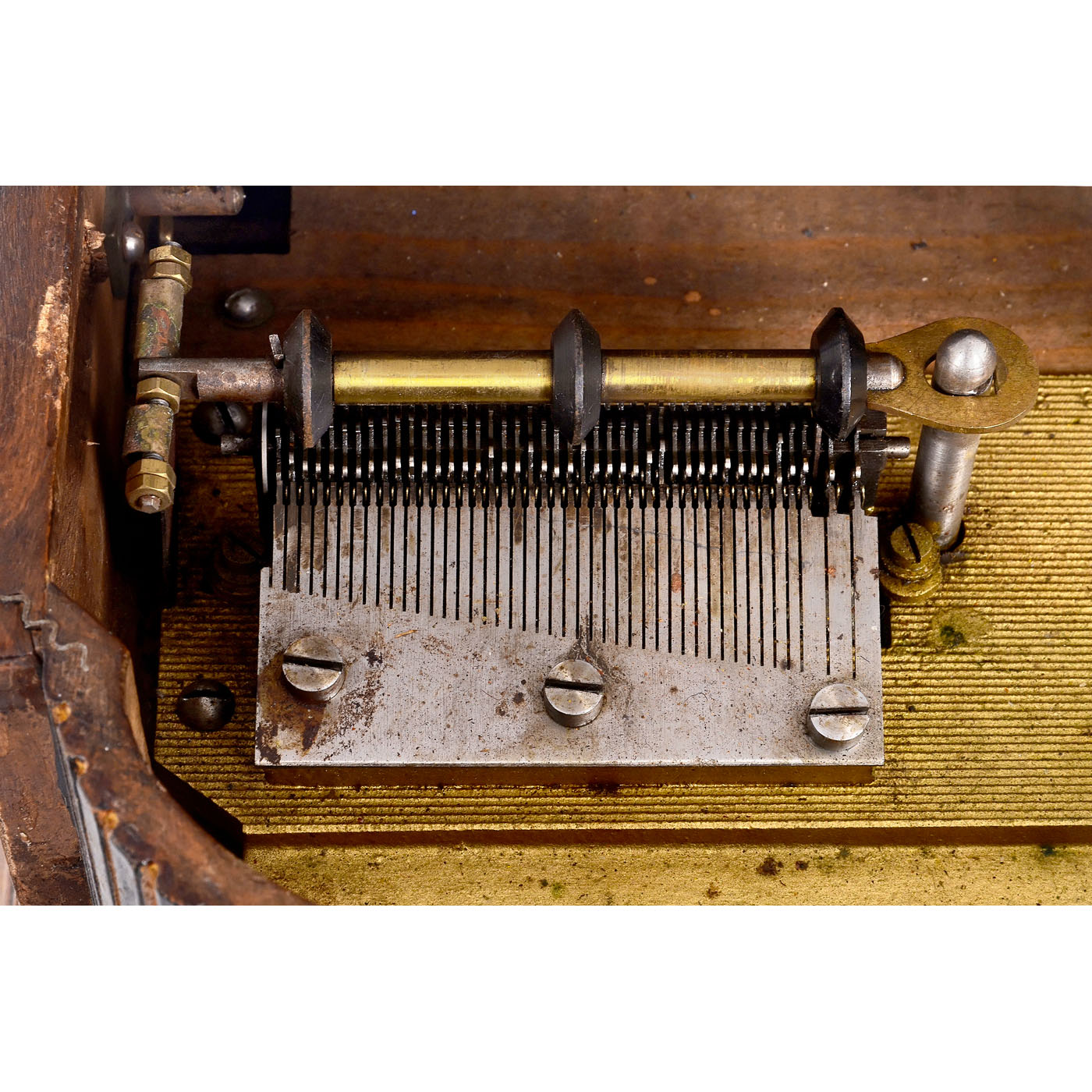 Manufacturer: "Leipziger Musikwerke (Paul Ehrlich)". For 7 ? in. discs, 44 teeth in steel comb, complete! With 33 discs, missing tree mount.