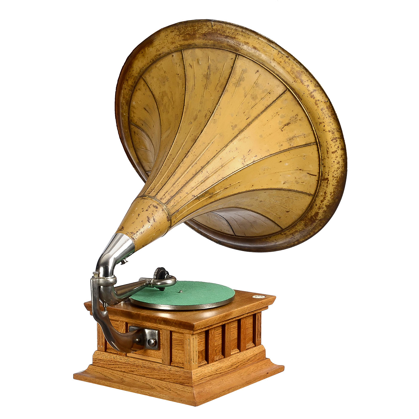 Deutsche Grammophon A.G. Original lacquered horn with decal "The Gramophone Company Ltd.", ? 25 3/5 in., double-spring motor, Exhibition soundbox, 10-inch turntable, light-colored oak case, embossed serial no. 13259, corner pilaster strips each with two flutes, plaque with writing angel, good playing condition.