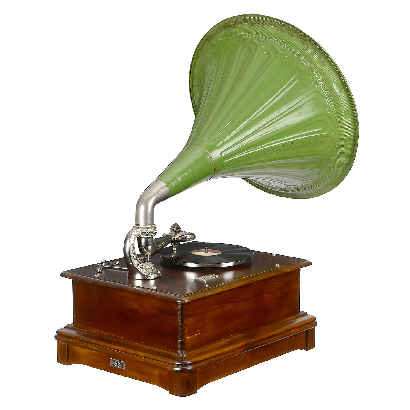Probably by Carl Lindstr?m AG, Berlin. Coin-slot, walnut case with embossed metal sheet showing a Roman chariot, coin-drawer, mica reproducer, metal horn.