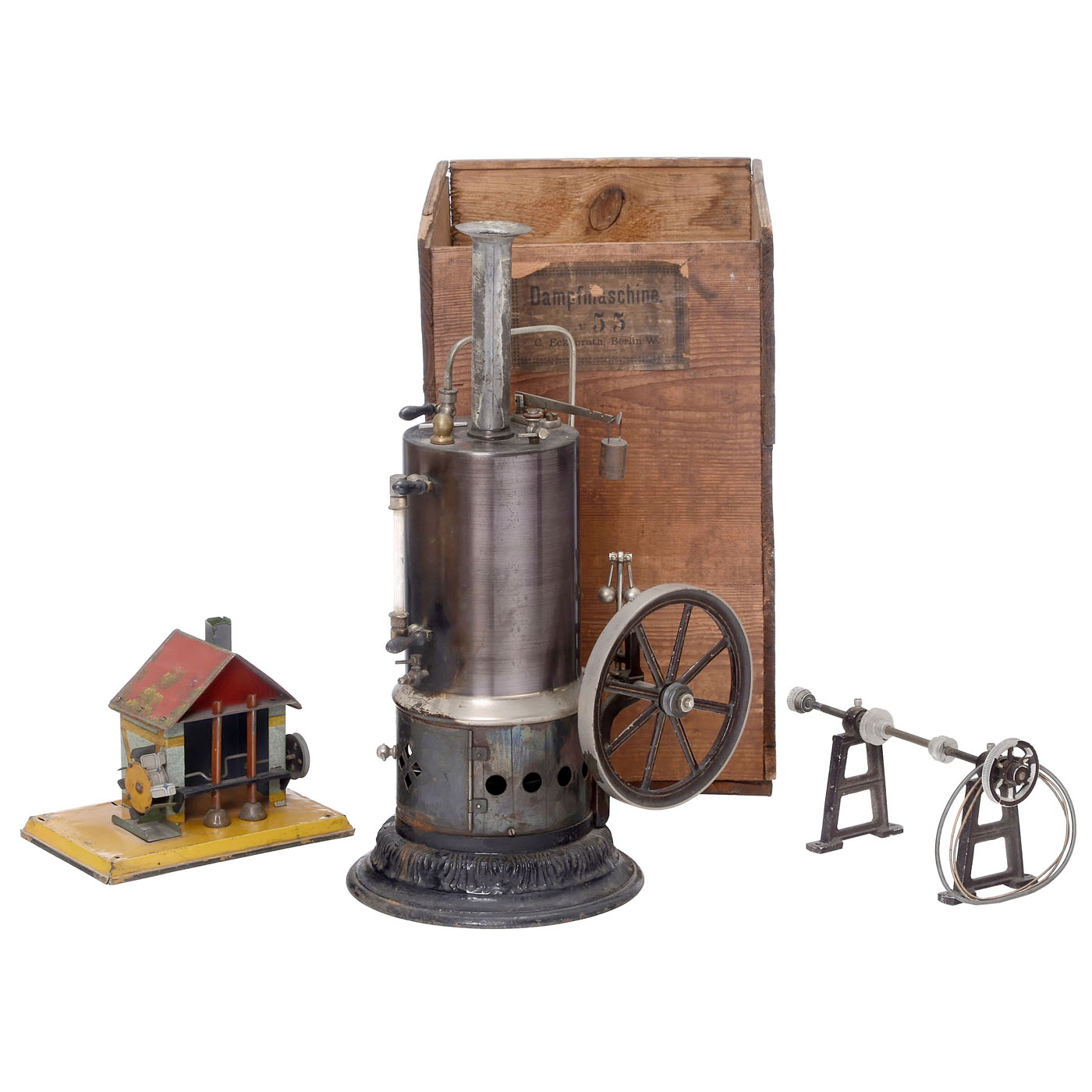 Schoenner 101/6, brass boiler ? 4 in., flywheel ? 5 in., with fixed cylinder, slide valve control, weighted safety valve, water level indicator and stopcock, on lacquered cast-iron base, total height 15 in., burner later, smooth running, in original Schoenner wood box, with transmission and hammermill.