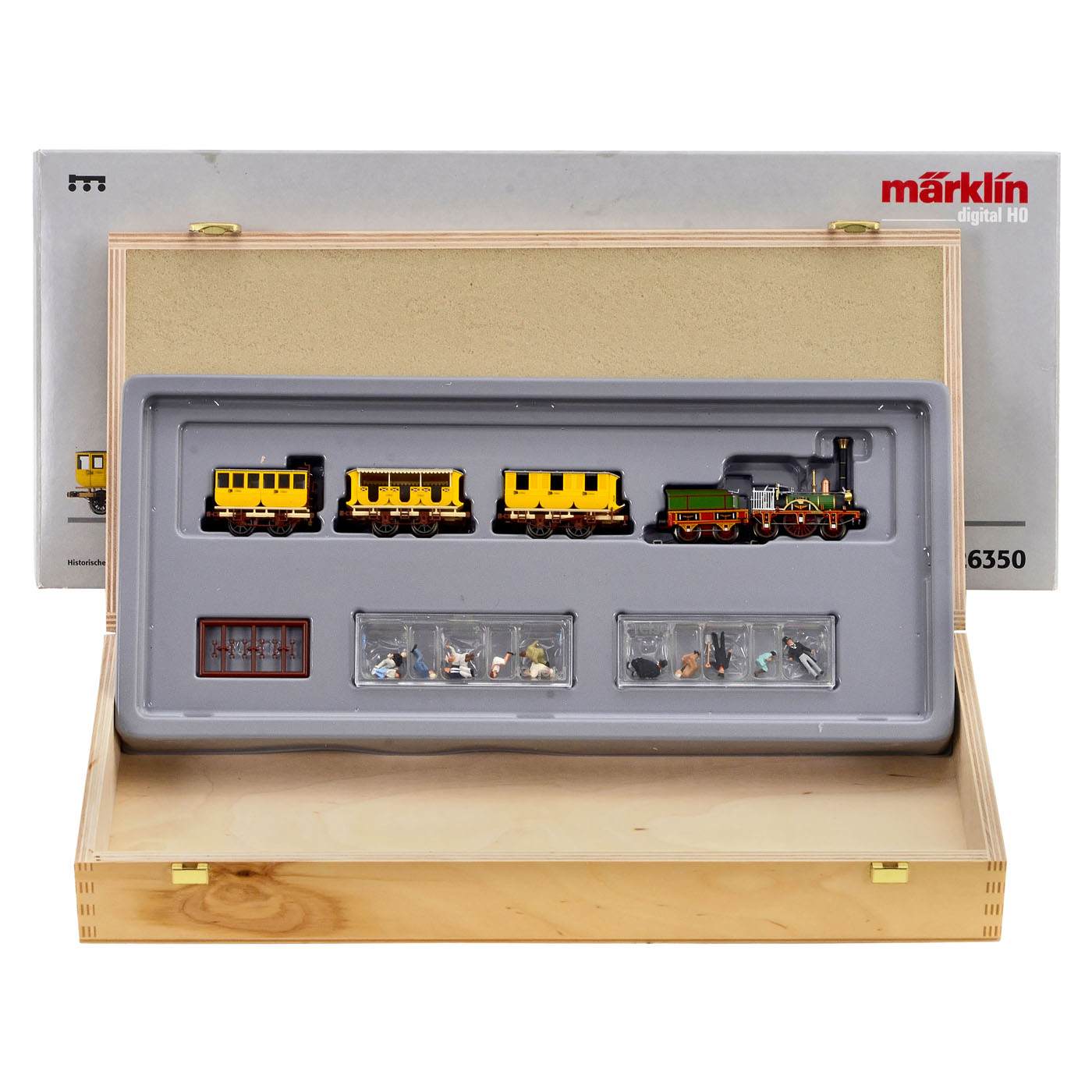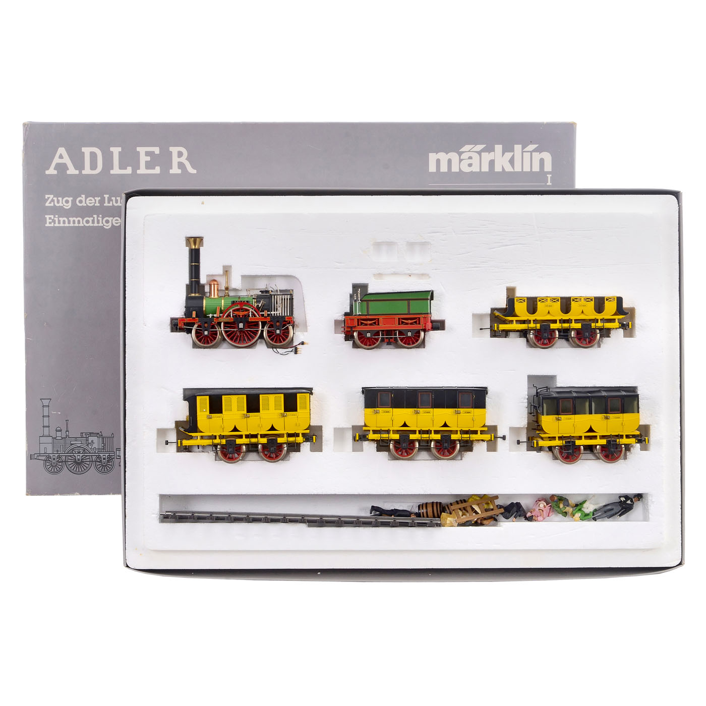 1) M?rklin 5750, I gauge, Adler steam locomotive and 4 cars, modeled after the 1835 version, with figures, original packaging.
