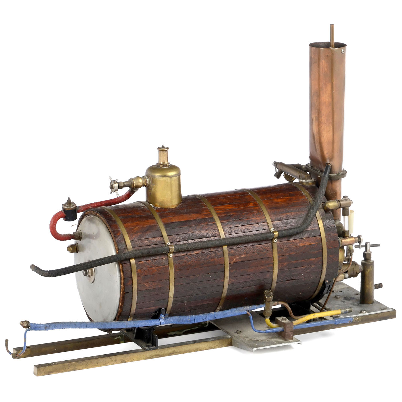 Mahogany-lagged brass-bound boiler. Gas-fired, welded steel boiler, length 13 3/4 in., ? 6 3/4 in., with English manometer, water level glass, steam dome and hand-operated feed pump.