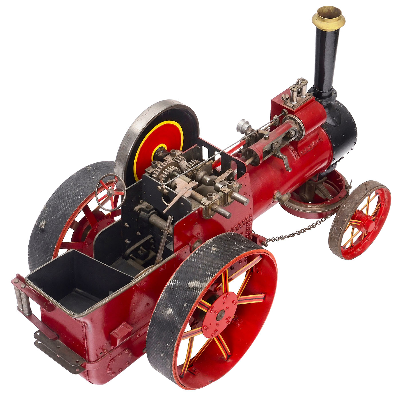 Working model of a British single-cylinder engine, steel, cast-iron and brass construction, coal-fired, flame-tube boiler, two-speed gearbox, fusee-and-chain steering, reversible traction, spoked wheels, front ? 5 1/3 in., rear ? 8 7/8 in., flywheel ? 6 3/4 in., overall size 25 2/5 x 11 2/5 x 16 1/2 in.