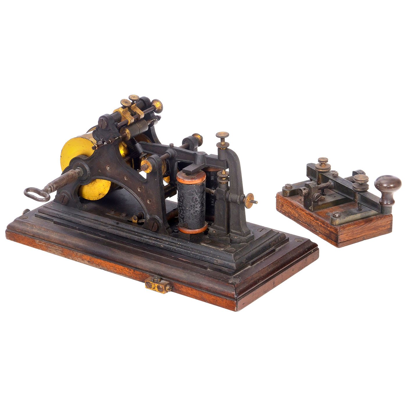 With brass plaque "Siemens & Halske, Berlin, No. 13481", spring-driven mechanism (in working order), cast-iron frame and base, on a walnut socket with side lever to start the spring mechanism, built according to the American register model, still without attached paper reel, with matching cast-iron Morse key.