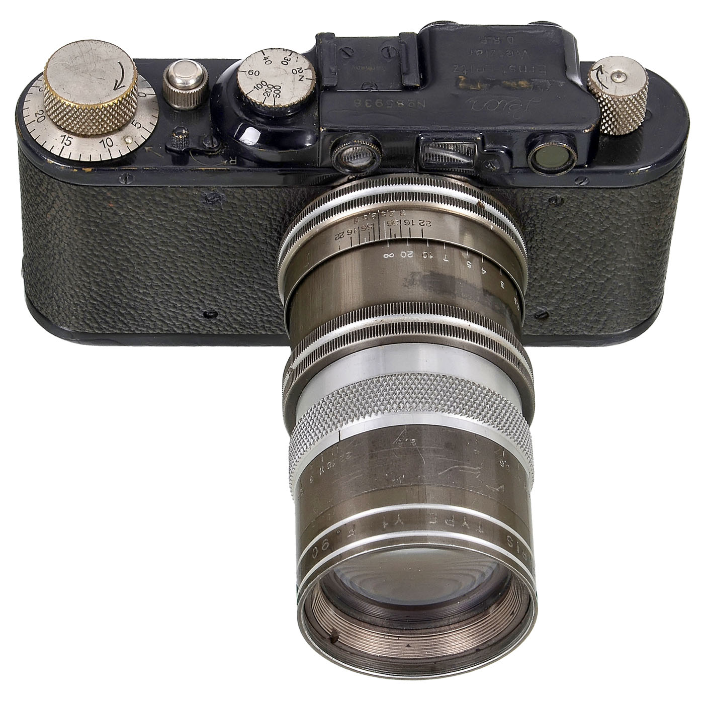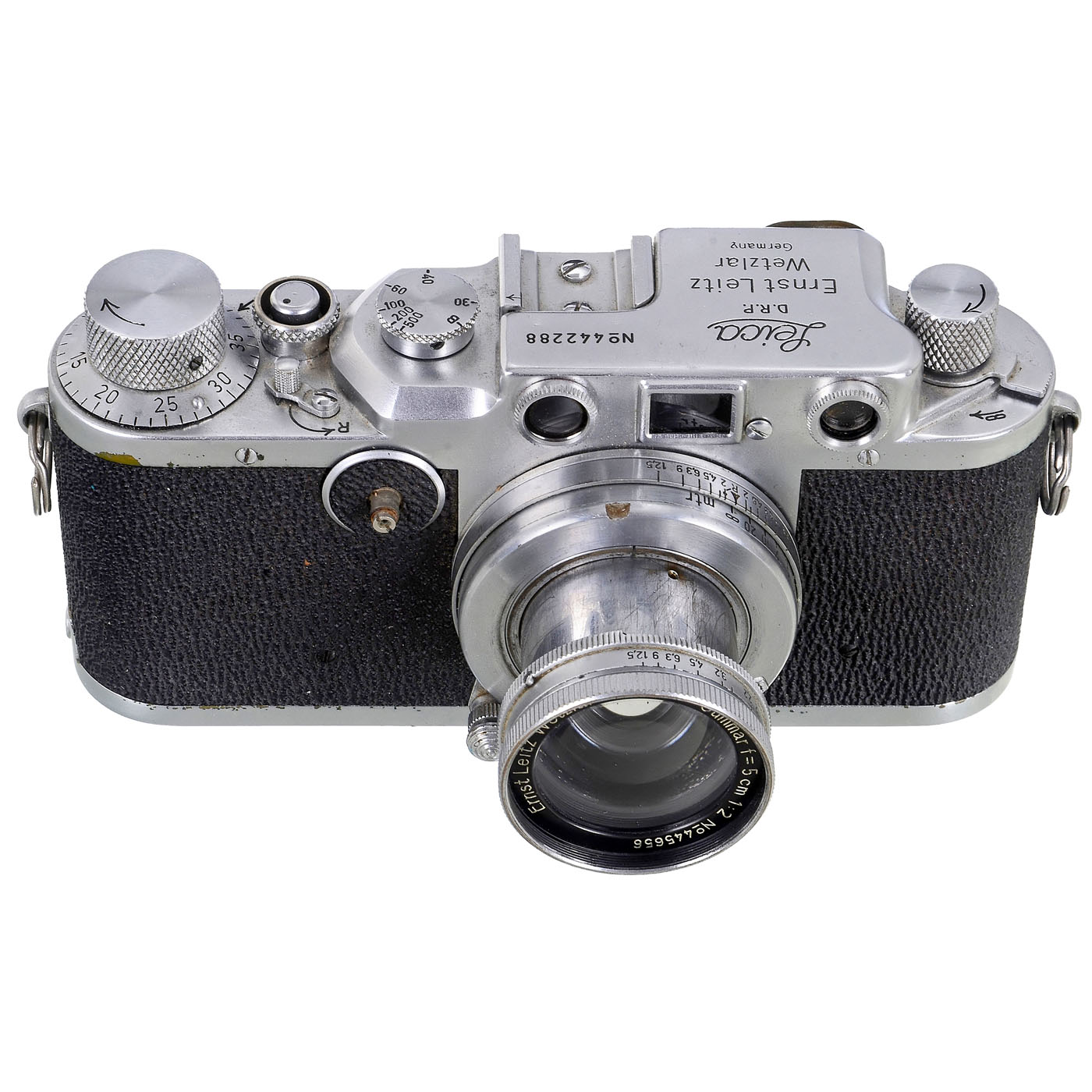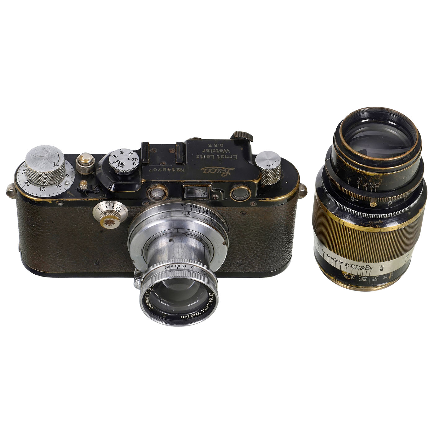 Leitz, Wetzlar. 1) Leica IIc, no. 442288 (nice number!), c. 1948ÿ51, with Summar 2/5 cm no. 445656, notch for Agfacolor lens grid, with synchronisation (not from Leitz). (3/3) ÿ 2) Leica III, no. 149767, c. 1935, with Summar 2/5 cm (some fog inside), with chrome-plated: Transport, counter, shutter speed and rewind button. Otherwise beautiful patina. (3/3) ÿ 3) Leica II, no. 85938, c. 1932. Camera repainted in many places, presumably also a "special engraving" between the Leica and Ernst Leitz engraving. What could this be? (3-/3) ÿ 4) Elmar 4.5/13.5 cm head, no number, c. 1933, focusing tube for approx. 45 mm screw thread, distance from thread to infinity 72 mm (would be suitable for medium format 4.5 x 6 cm). (3-/3-) ÿ And: 5) Angenieux, Paris. Angenieux Y1 2.5/90 mm no. 94847, with M39 rangefinder coupling, aluminum aperture ring, outer lens with minor cleaning wear when viewed under point light. (3-/3)