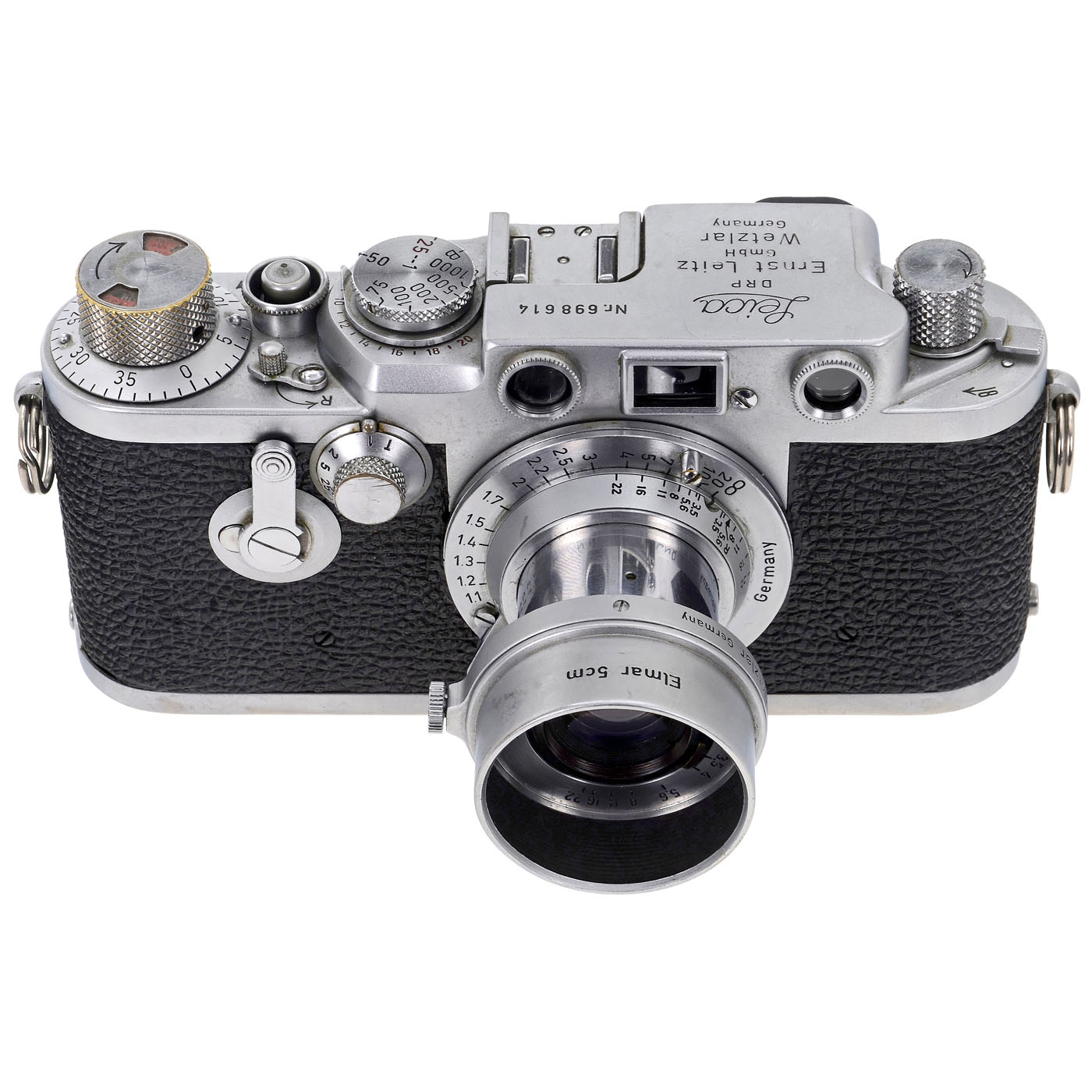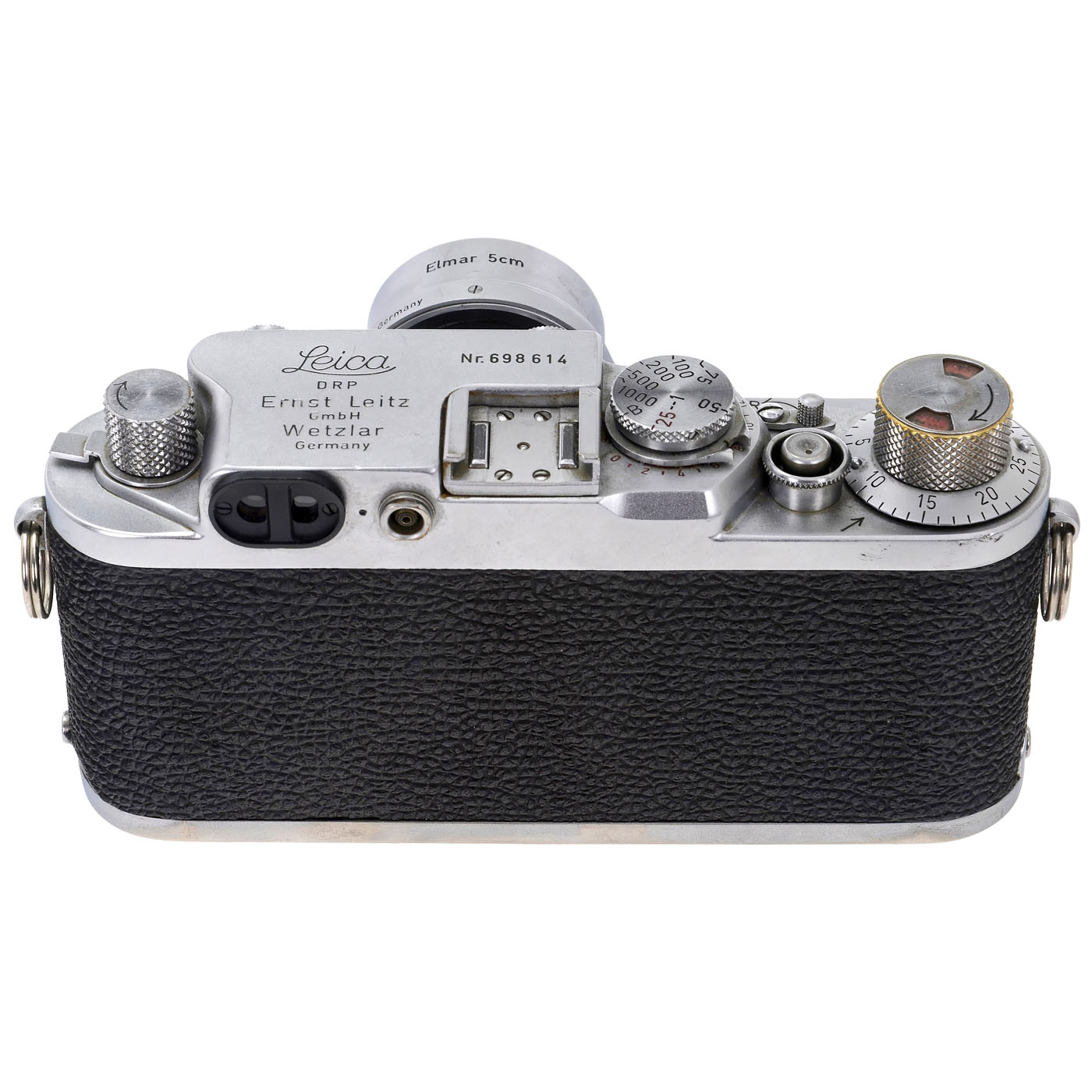 Leitz, Wetzlar. No. 698614, version with red dial numbers, shutter speed 1ÿ1/1000 sec., coupled rangefinder, self-timer. All mechanical parts operate very smoothly. Lens: Leitz Elmar 3.5/5 cm, no. 870371, with original lens hood. Very good condition! ÿ In addition: "Leica ÿ Das Produkt- und Sammler-Buch" by Dennis Laney, 1993.