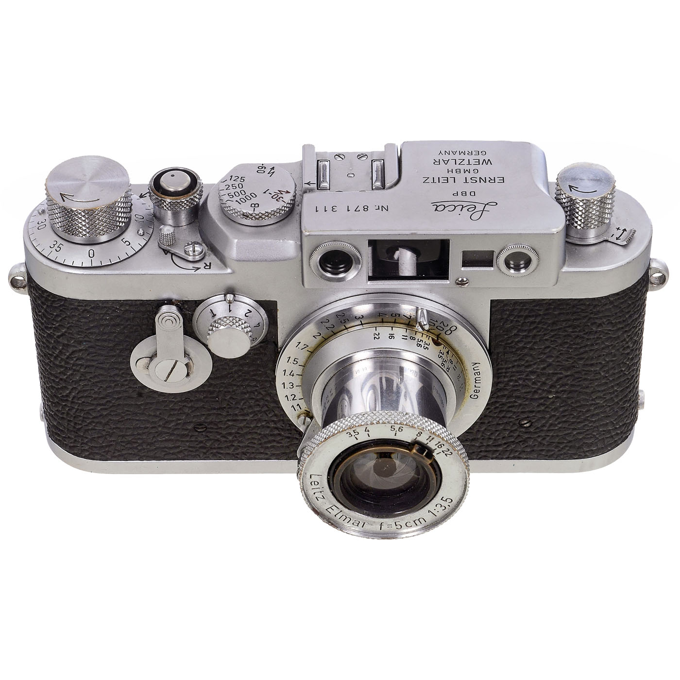 Leitz, Wetzlar. No. 871311 with Elmar 3.5/5 cm (c. 1949) no. 745358. Vulcanite damage below the lens mount and on the self-timer. The inner film type mark on the rear film indicator disc is missing. Viewfinder clear, shutter and rangefinder working. With case.