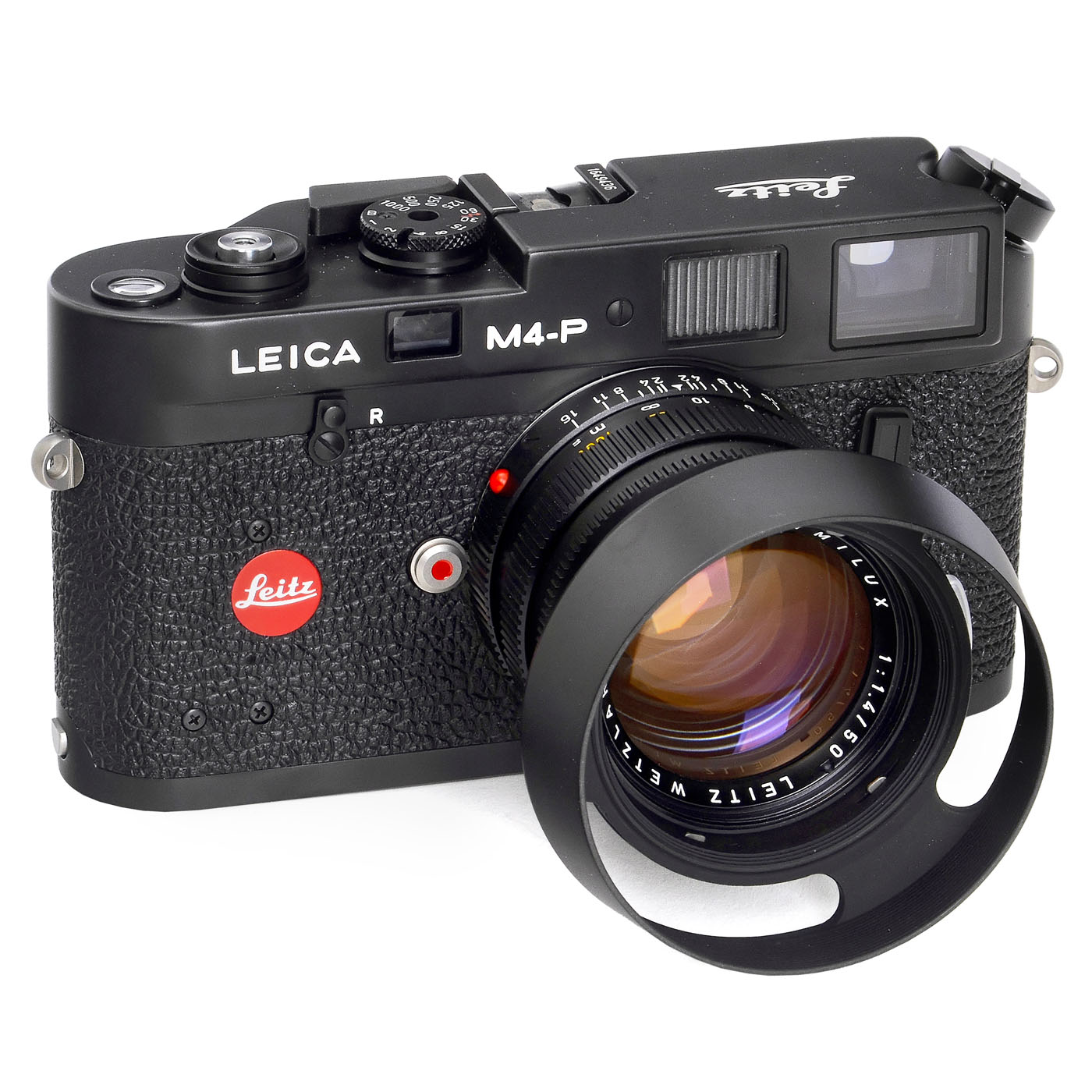 Leitz, Wetzlar/Canada. 1) M4-P no. 1649436, black chrome-plated, optically in mint condition. Long shutter speeds from 1/30 sec. stick. A popular "wide-angle M-camera" and especially sought-after by professionals. With box, instructions, matching-numbered warranty card, Leica passport, and M4-P brochure. (2/3) ÿ 2) Summilux 1.4/50 mm no. 3251280, glass clean under point light, 43 mm filter thread, with lens hood 12586, with matching-numbered box and warranty card. Mint condition. (2/2) ÿ And: 3) Leitz, Wetzlar. Camera Lucida as a microscope attachment. Before cameras existed in 1839, drawing was done with an optical aid. As a reminder for a collector's display case of how it all began. (3/3)