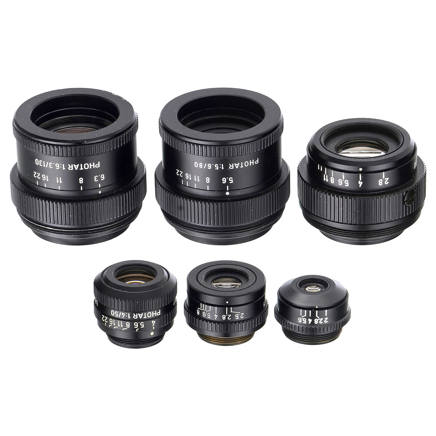Leitz, Wetzlar. All Photar last rare version, all with iris, all good or clean under point light. 1) Photar 1.9/12.5 mm. (2/2) ÿ 2) Photar 2.5/25 mm. (2/2-) ÿ 3) Photar 2.8/50 mm, M40 mount. (3/2-) ÿ 4) Photar 4/50 mm. (2-/2-) ÿ 5) Photar 5.6/80 mm, M42, with box. (2/2) ÿ And: 6) Photar 6.3/130 mm, M42, front ring with some scratches. (3-/2-) ÿ So Leitz also built M42 lenses!