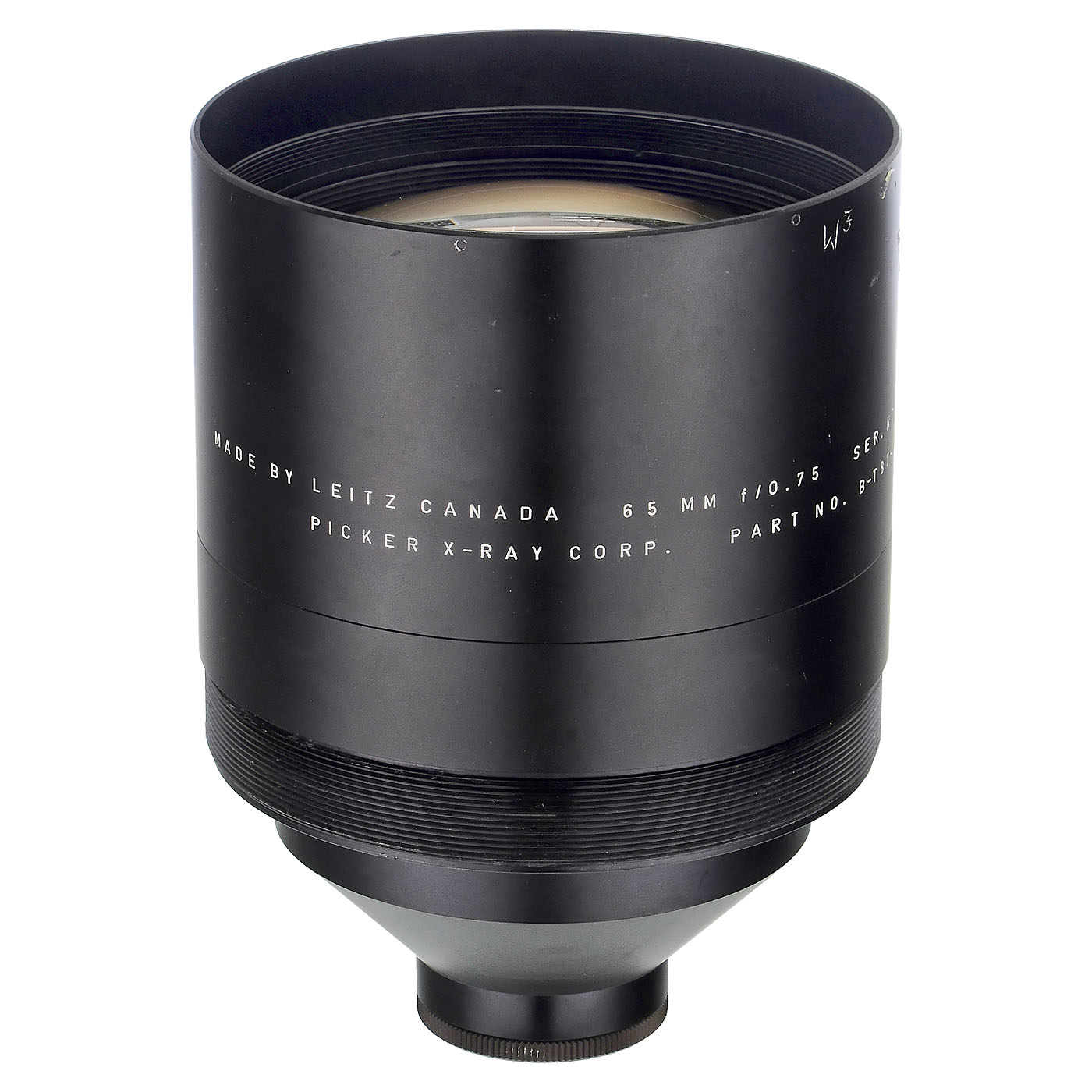 Leitz, Canada. Serial no. 252-0472, diameter 102 mm, height 139 mm, with additional engraving "Picker X-Ray Corp. Part No. B-T 87-132", highspeed radiography lens, glass clean under point light, with protective glass on the rear lens, approx. 3ÿ4 mm distance from protective glass to infinity focus with a sensor format of approx. 22 mm. A fast lens for digital Leica cameras!