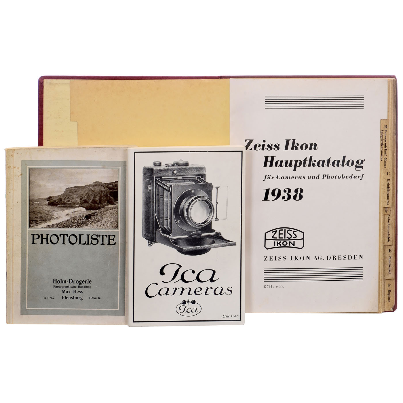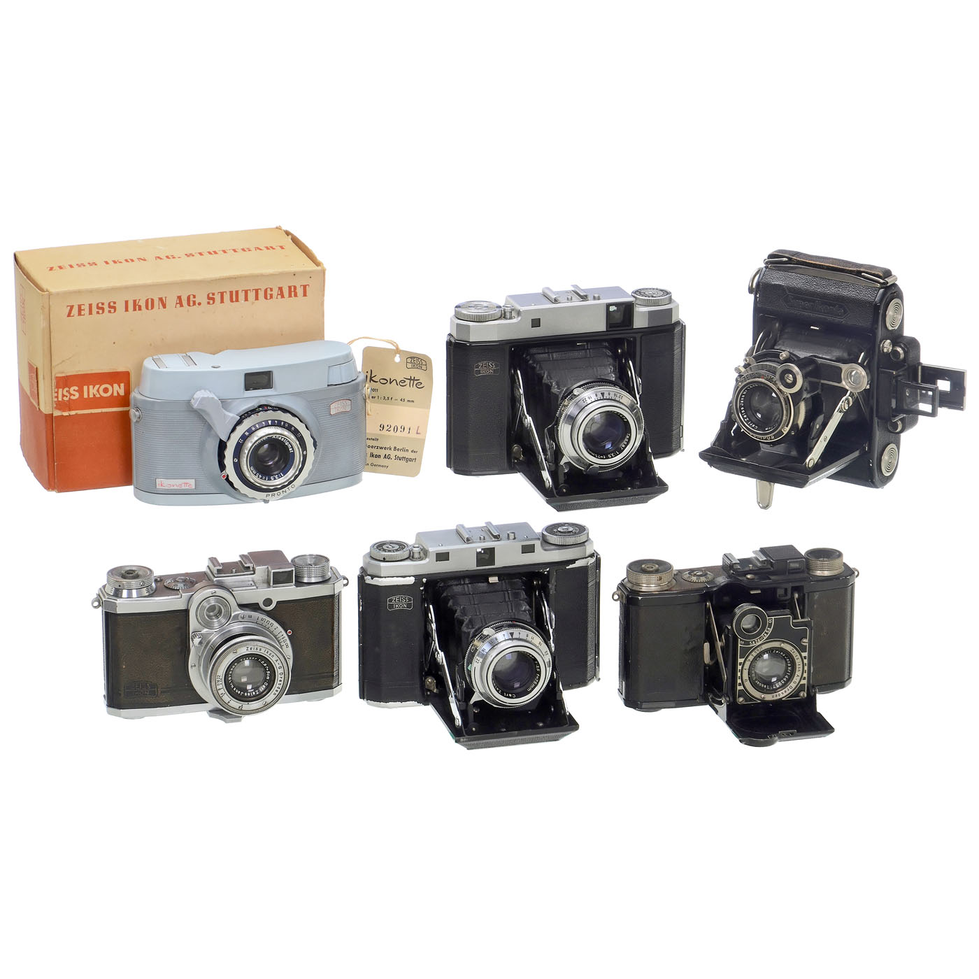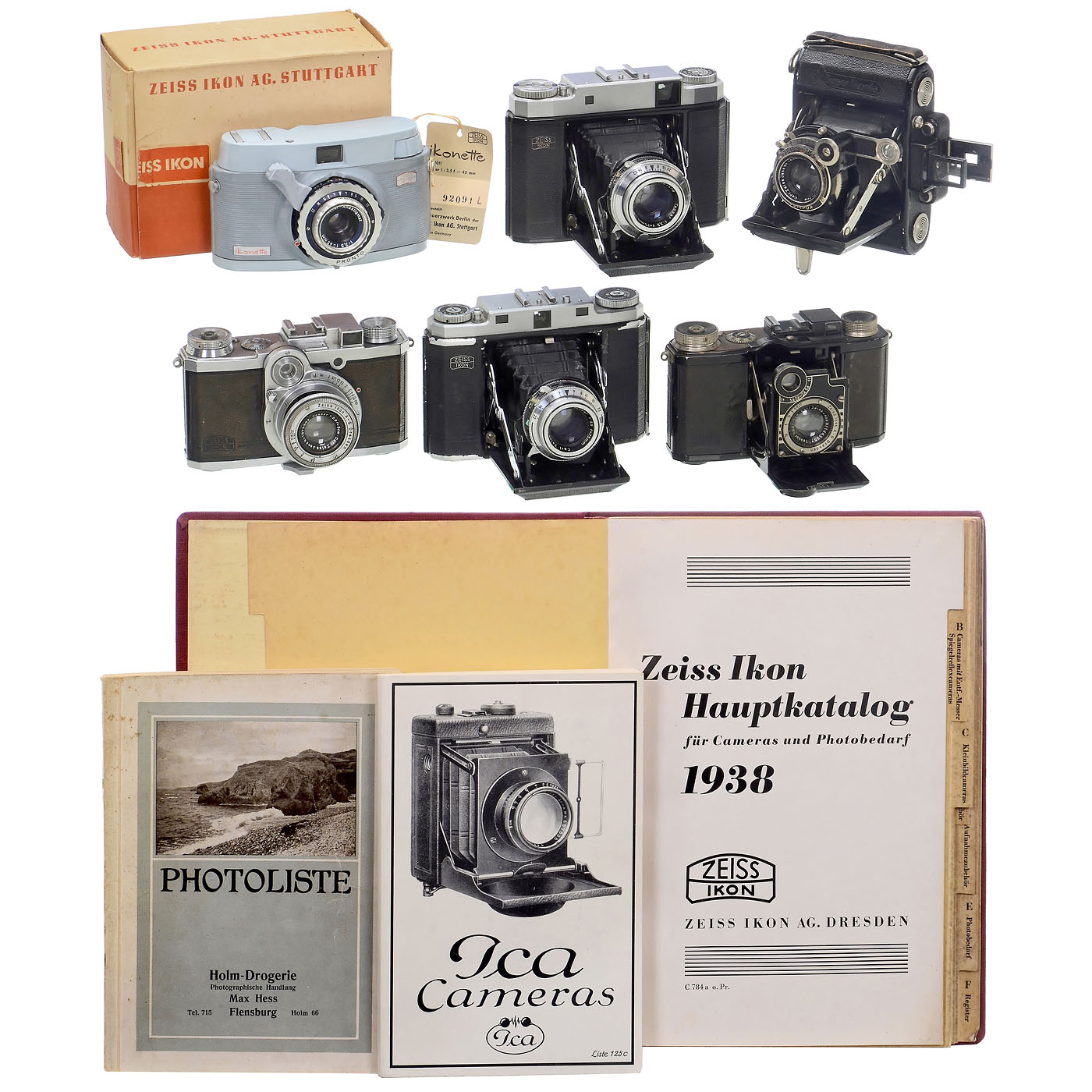 Zeiss Ikon, Dresden and Stuttgart. 1) Tenax II 580/27, no. B30499, Tessar 2.8/50 mm lens, rangefinder and shutter function. (3-/3+) ÿ 2) Super Nettel, no. X930048, shutter responds, Tessar 2.8/50 mm lens. (3ÿ4/4) ÿ 3) Super Ikonta 530, for 4.5 x 6 cm film (120), Tessar 3.5/75 mm lens, shutter working, rangefinder with slight parallax error. (3/3) ÿ 4) Super Ikonta 531/16, 6 x 6 cm, Tessar 3.5/75 mm lens, shutter and rangefinder functional. Good working camera for a user. (2-/2) ÿ 5) Ikonta-M 524/16, 6 x 6 cm, Tessar 3.5/75 mm lens, minor paint damage on the front. (3-/3+) ÿ 6) Ikonette, light blue plastic, with original sales tag, box, pouch and blue case. (3/ÿ) ÿ And: 7ÿ9) Main catalog 1938 "C784a o Pr", red cloth binding, Ica Photo List 1911, 245 pages, and reprint of Ica Cameras 1925, 147 pages.