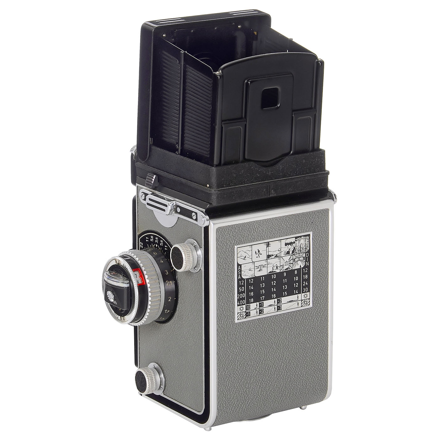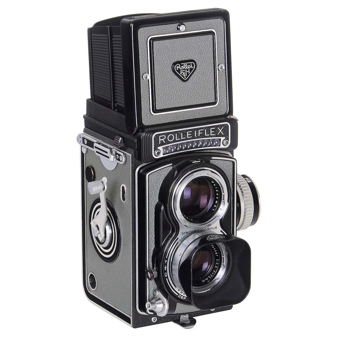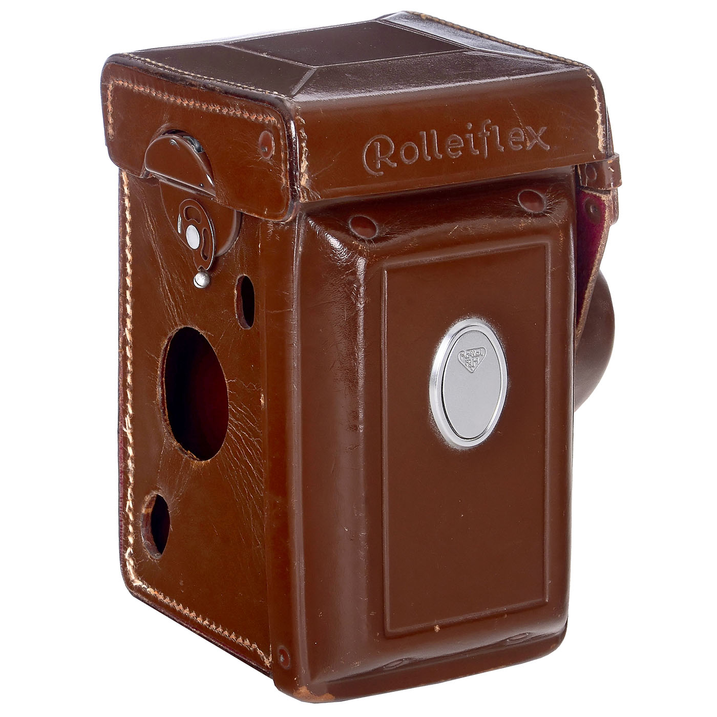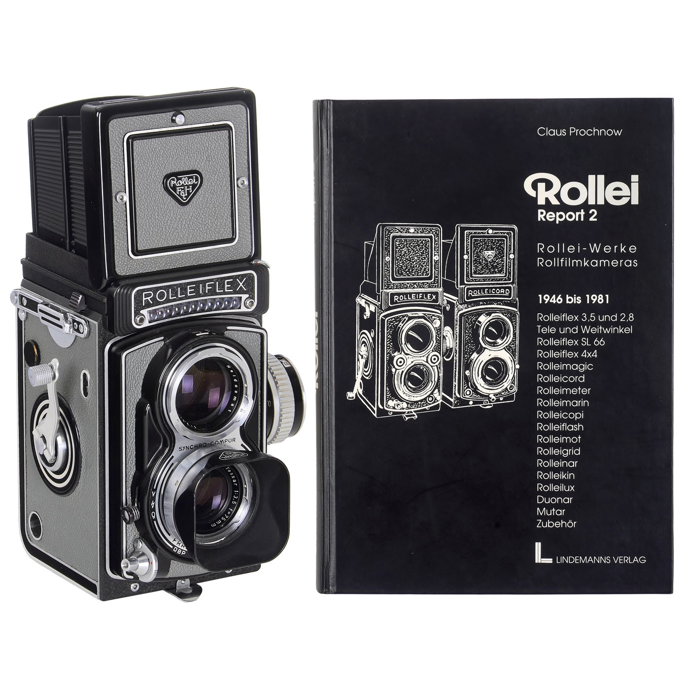 Franke & Heidecke, Braunschweig. Body no. 2107641, internal designation K8. Version with built-in dual-range light meter, very accurate! Tessar 3.5/75 mm, coated, from Carl Zeiss Obercochen no. 1681182, in Synchro-Compur MXV/CROO 1ÿ1/500 sec., works exceedingly well! Heidosmat 2.8/75 mm viewfinder lens no. 2463705, first single-format back. Minimal spot on the focusing screen, otherwise in mint condition! With original lens hood. (1-/1) ÿ In addition: "Rollei Report 2" by Claus Prochnow, first edition 1994 (picture of the camera page 18-408), and ever-ready case.