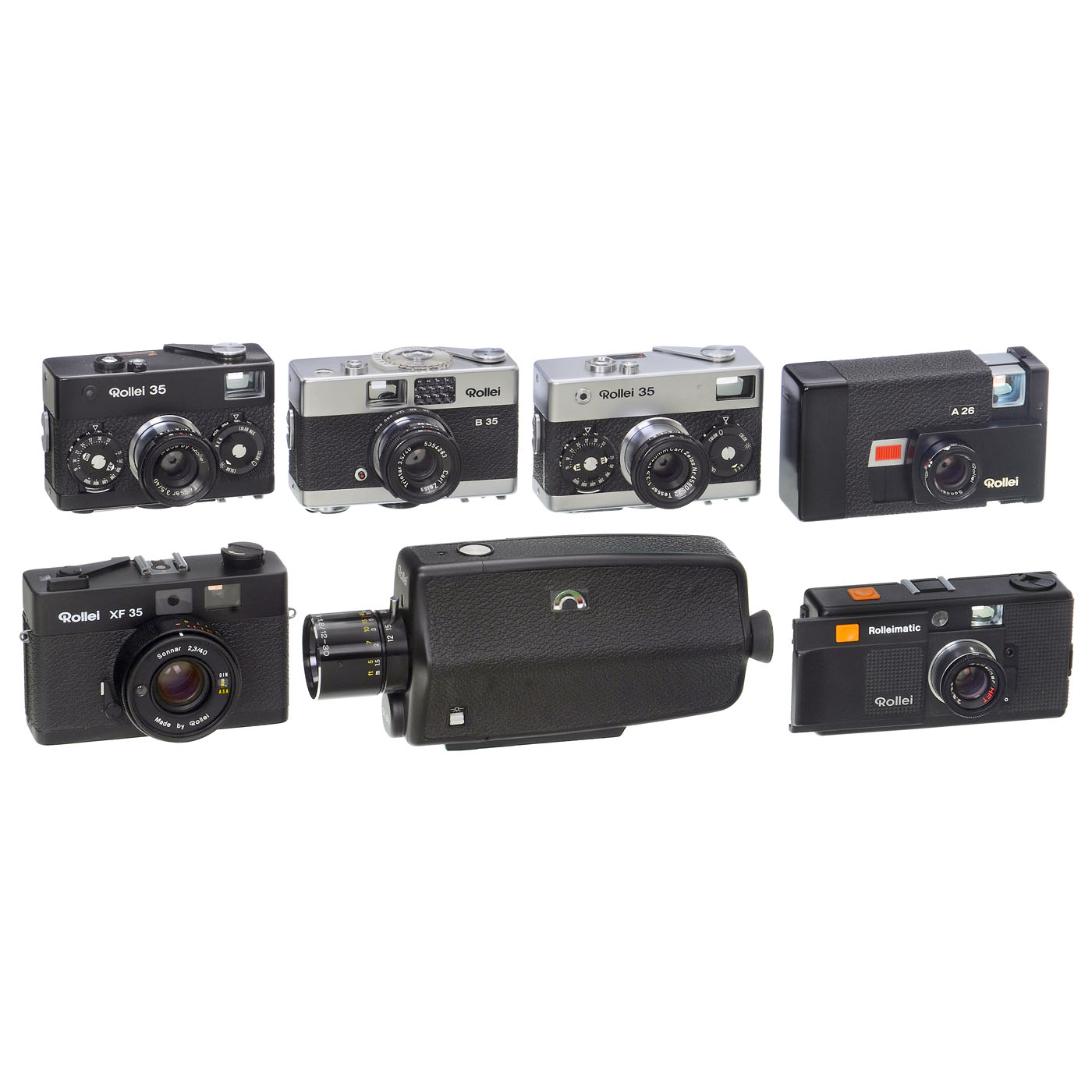 Franke & Heidecke, Braunschweig/Rollei, Singapore. 1) Rollei 35 "Made in Germany", very early model, with metal rewind mechanism. Rare to find in this excellent condition! With original box and matching serial number, Rollei H1 filter and instruction manual. (2/3+) ÿ 2) Rollei B35, very good condition! With original box, matching serial number and instruction manual. (3+/3+) ÿ 3) Rollei 35 black, good condition! With box and matching serial number. (3+/3) ÿ 4) Rollei XF35, all black, including the filter ring. Working and in near-mint condition. With instruction manual. (2/3+) ÿ The following cameras have not been tested: 5) Rollei Rolleimatic, with box, instruction manual and brochure. (3+/ÿ) ÿ 6) Rollei A26 with box, instruction manual and brochure. (3+/ÿ) ÿ 7) Rollei E110 "Made in Germany", complete in box with instruction manual. (2-/ÿ) ÿ And: 8) Rollei E15 flash unit, Rollei 35 box, Rollei mini-poster 58 x 41 cm, various brochures and a small tripod.