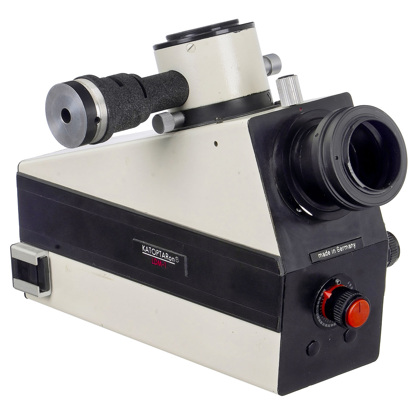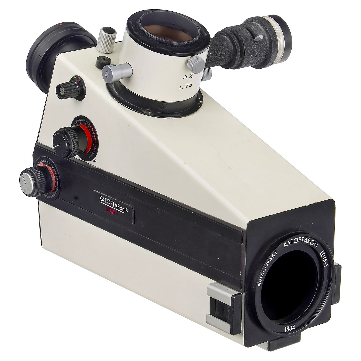 Dr. Helmut Makowsky, Opt. Ger?te, Troisdorf near Cologne. No. 1834, 11/800 mm mirror lens with iris diaphragm, based on his Katoptaron "Schiefspiegler" lens design consisting of two quartz ZERODUR Schott glasses, UV-IR transmission (approx. 200 nm to 4000 nm), from infinity to approx. 3 meters for very high magnifications, knob on the back for fine mirror adjustment depending on the scale, higher magnifications possible with screw-on achromatic lenses, camera connection via T2 adapter, and an additional camera connection for a second camera, where a pivoting beam splitter with illumination attachment, filter insert, and iris diaphragm can be used to project illumination onto the macro object. Very rare to find, as it cost $8,500 new at the time.
