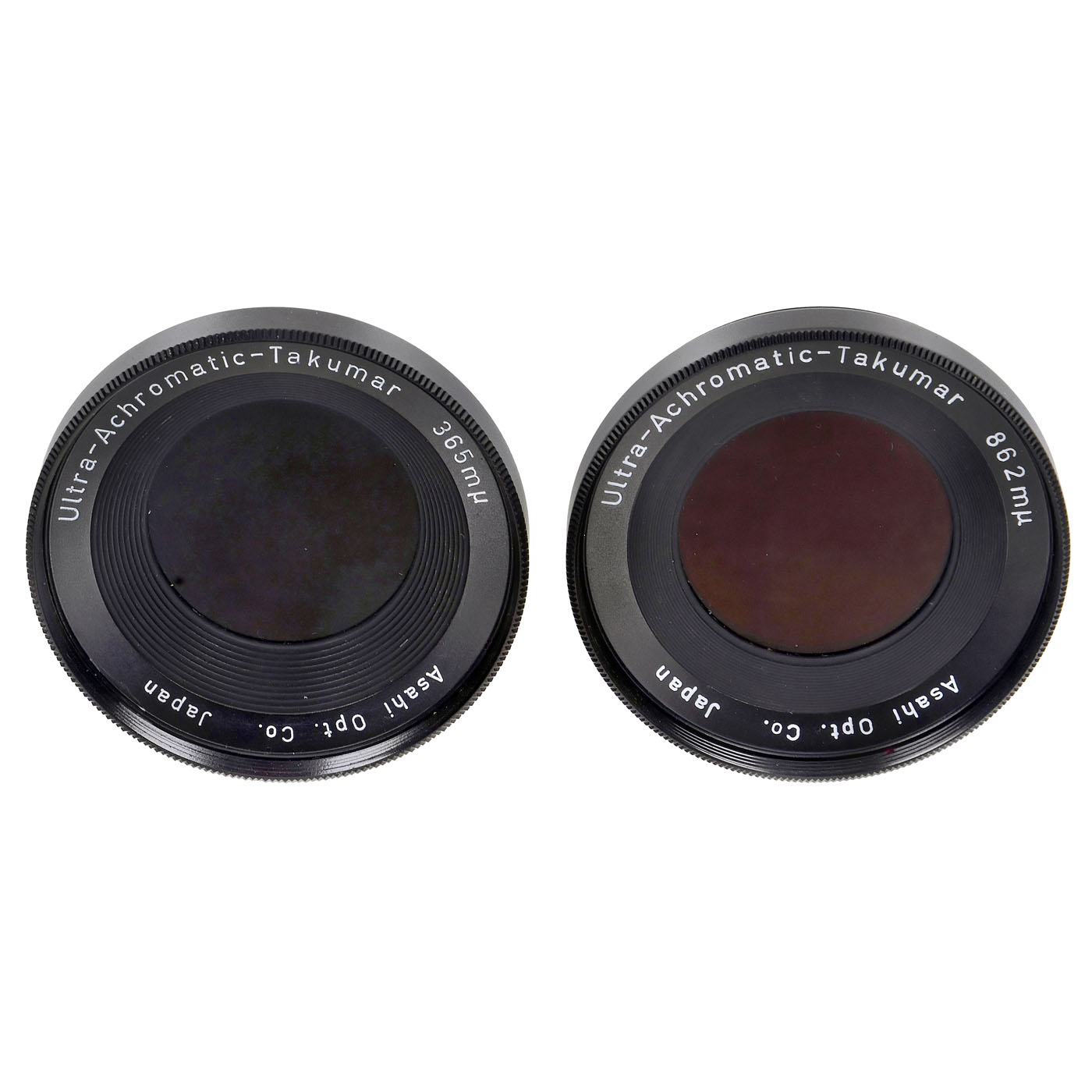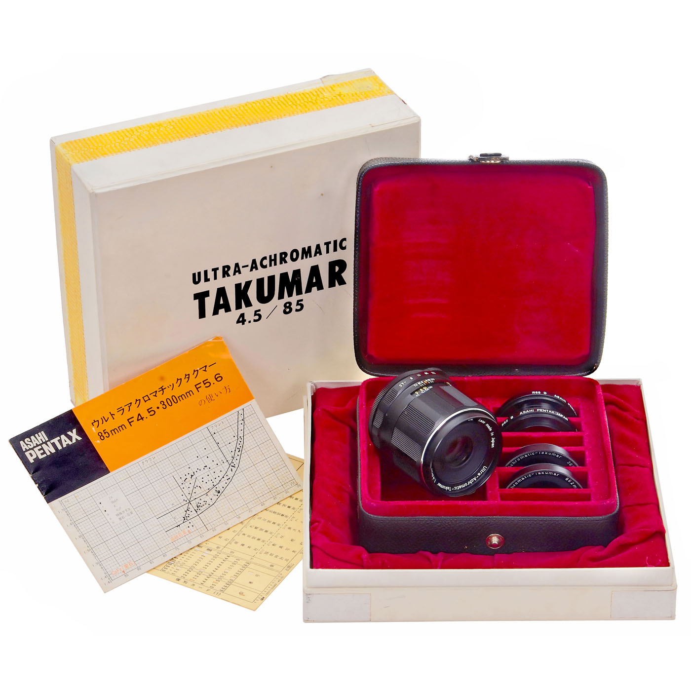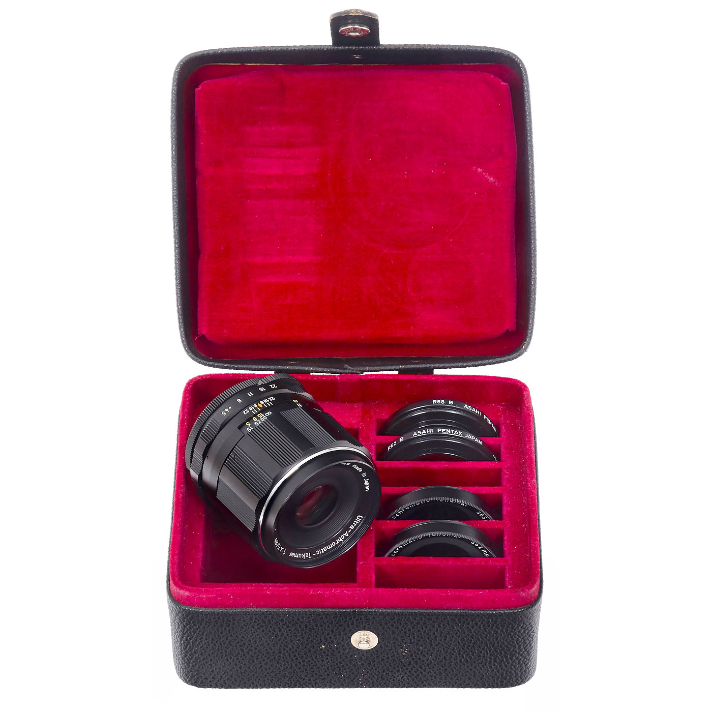 Asahi Opt., Japan. No. 3605072, for M42, it consists of both Quarz and Fluoride lenses and was designed for use with ultraviolet, visible and infrared light. The fully achromatic correction results in no focus shift between UV, VIS and IR, thus allowing visual focus without correction. Achromatic correction range 220 ... 1000 nm. Filter mount M49. Product no. 43851 on underside of auto/man lever. With instructions, following narrowband interference filters for infrared photography R62B, R68B and 862 nm, and for ultraviolet photography 365 nm. Glass clean under point light, with leather case for the outfit and original box. One of the great Pentax rarities. Mint condition.
