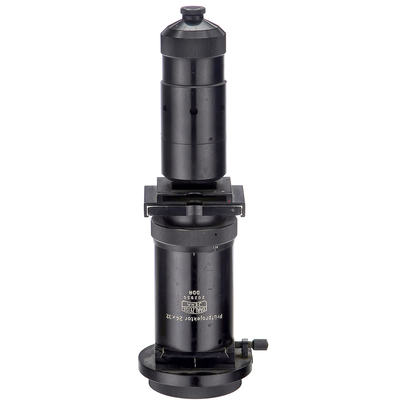 Carl Zeiss Jena, East Germany. Serial no. 202930, length 30.5 cm. Designed for inserting 5 x 5 cm slide mounts containing a test image on a glass plate for magnification scales of 0.92 to 1.14 (not adjustable). Includes a detachable lamp with built-in dimmer. The entire device can be moved in the x-y plane via a base plate. Features a 2-part bayonet mount with a 60 mm diameter. Besides internal quality control applications, this device would also have been suitable for the initial development stage of early electronic circuits. High-tech equipment from the early years of the economic boom ÿ even in East Germany.