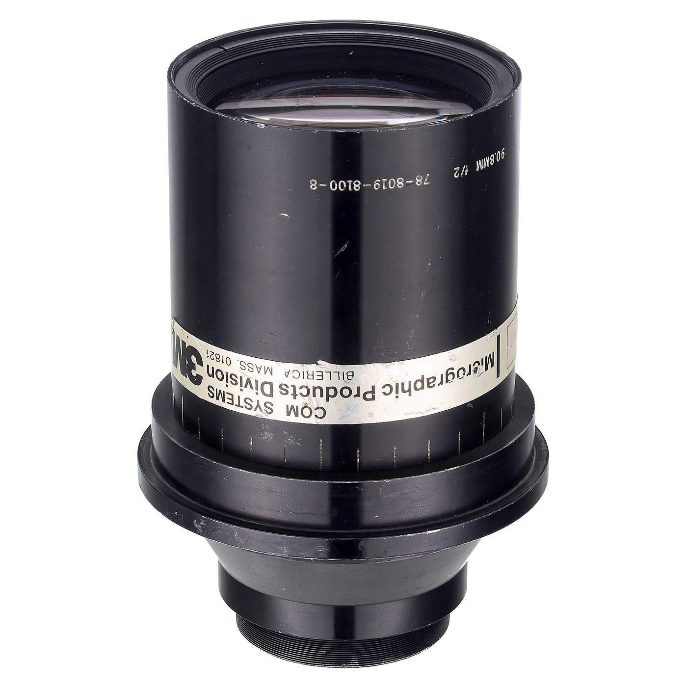 Olympus, Japan. Type 78-8019-8100-8, height 125 mm, heavy, robust mount, with archive no. "COM Systems Micrographic Products Division 3M"; lens glass in good to excellent condition under point light. ÿ High-resolution lens from the heyday of semiconductor manufacturing, an important tool for the initial reduction step.