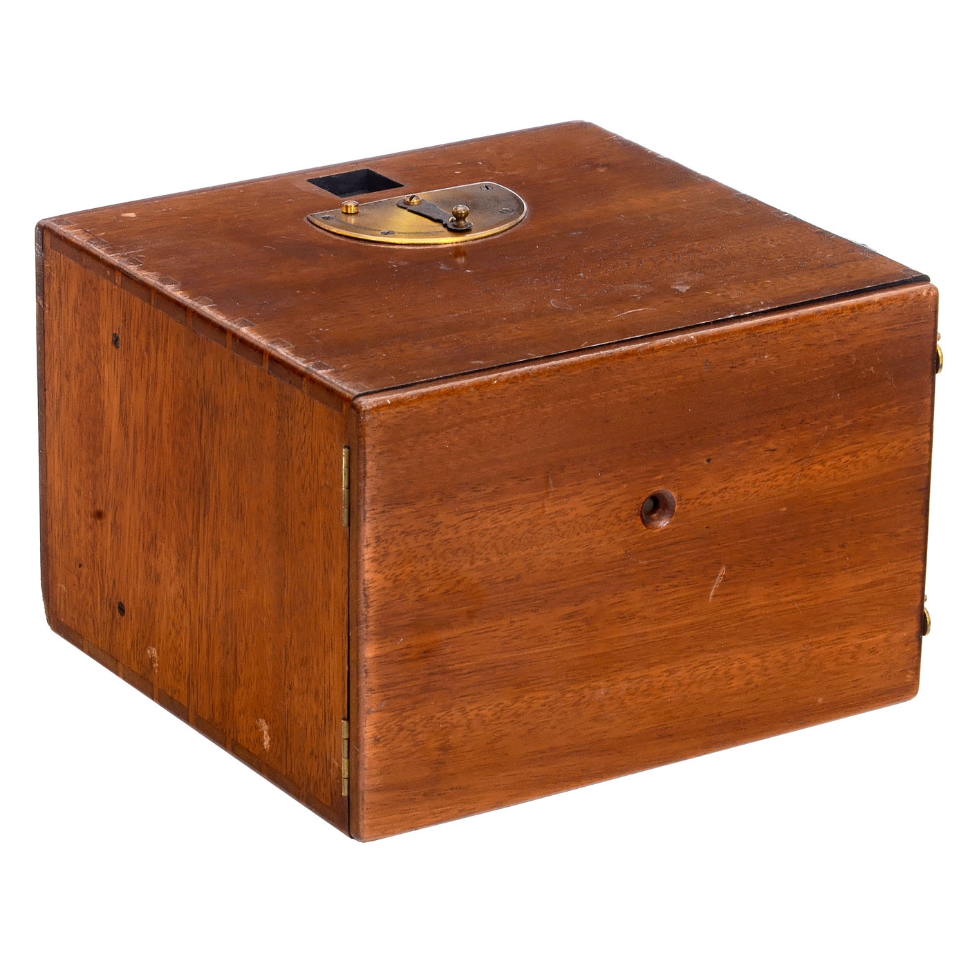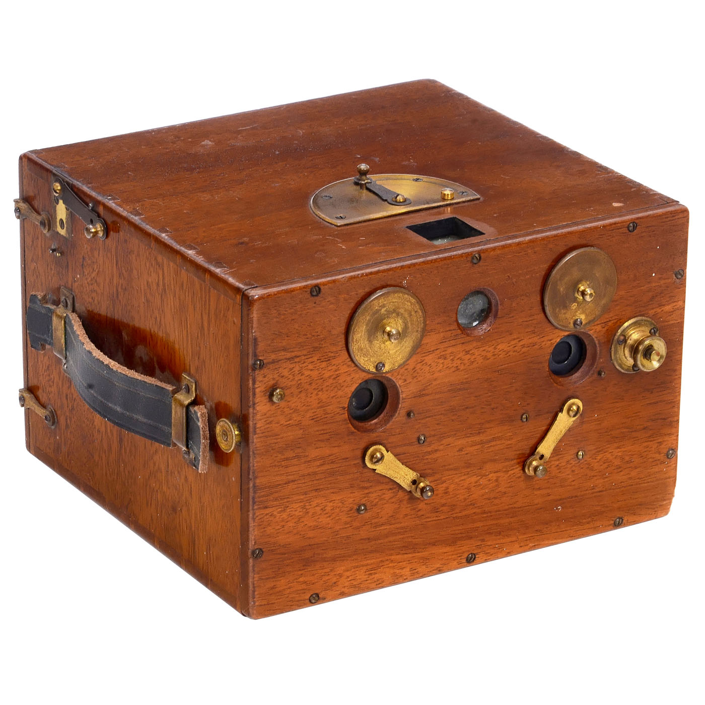Presumably Germany. Beautiful spruce wood with brass fittings, for 8 x 16 cm plates, a switch on the top of the housing from stereo to individual mono shots, rotating turret apertures for three settings, a working shutter, six internal inserts, and a carrying handle, probably replaced long ago. Dimensions (L/W/H): 17.5 x 16.5 x 12 cm. A previously unknown stereo camera, elegantly styled and in good condition.