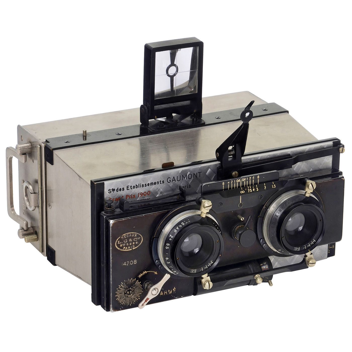 Establishment Gaumont, Paris, France. Model A, stereo plate format for the 6 x 13 cm (2 x 6 x 6 cm) format, nickel-plated metal body, lenses: 2 x Krauss Paris Tessar 6.3/84 mm, shutter: Decaux 1/5