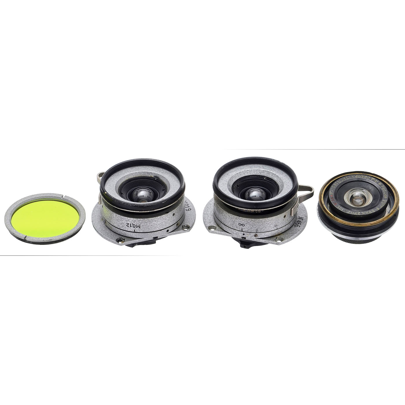 USSR. 1) 2 lenses similar to the Russar type, probably 5.6/20 mm, focusable with an infinity and 0.12x magnification setting. Lens nos. 019 and 466, gray hammer-finish paint, both in just good condition under point light. Includes a light green filter. Very lightweight, suitable for modern applications of a distortion-free ultra-wide-angle stereo camera. (3/3)
