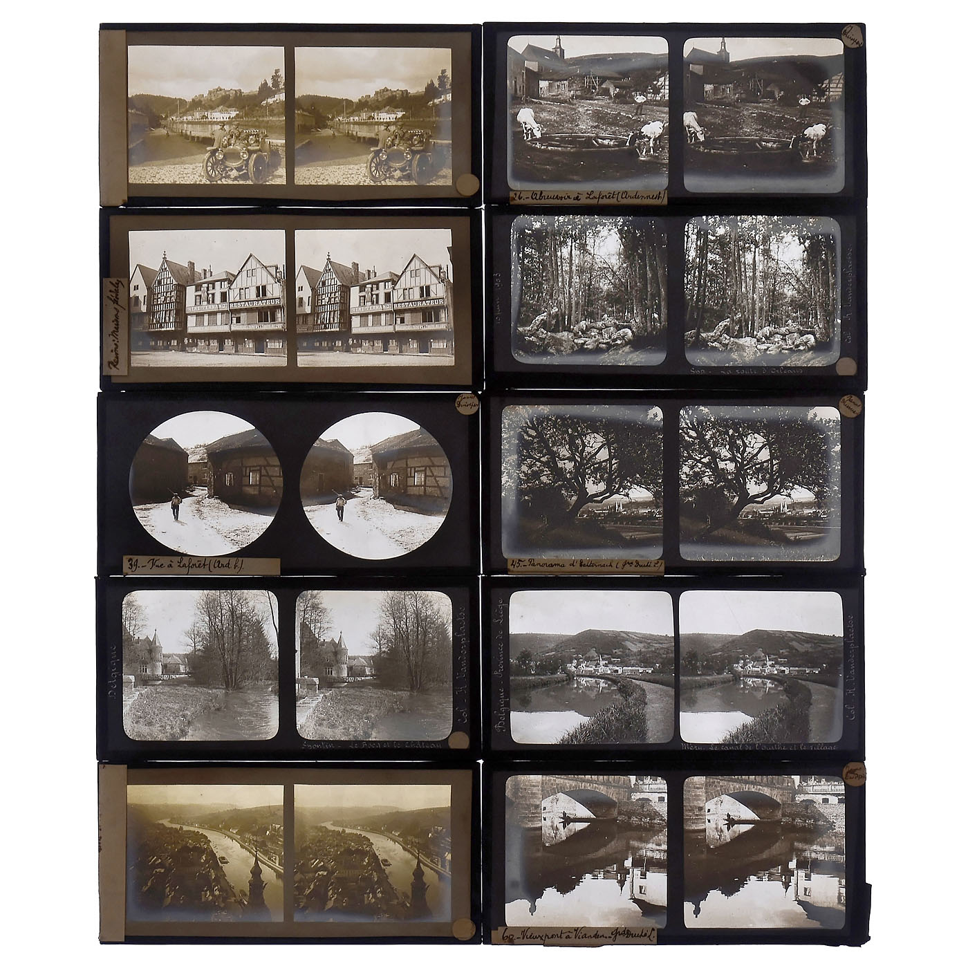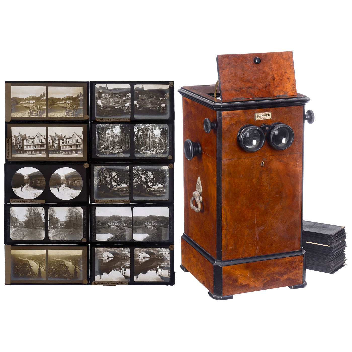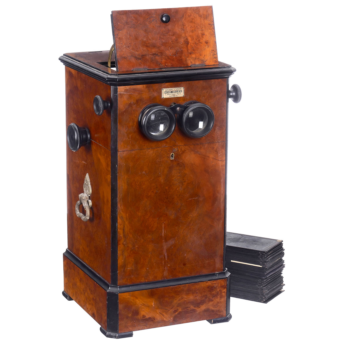 Bellieni, Nancy. Veneered burlwood case, conveyor belt for 50 slides or stereo cards in 8.5 x 17 cm, working, focusable eyepieces, bronze carrying handles on the sides, height 50 cm, with mirror and frosted glass, with 50 well-preserved stereo slides measuring 8.5 x 17 cm, post-1910 from Belgium, depicting its landscapes and cities. Decorative and in working condition.