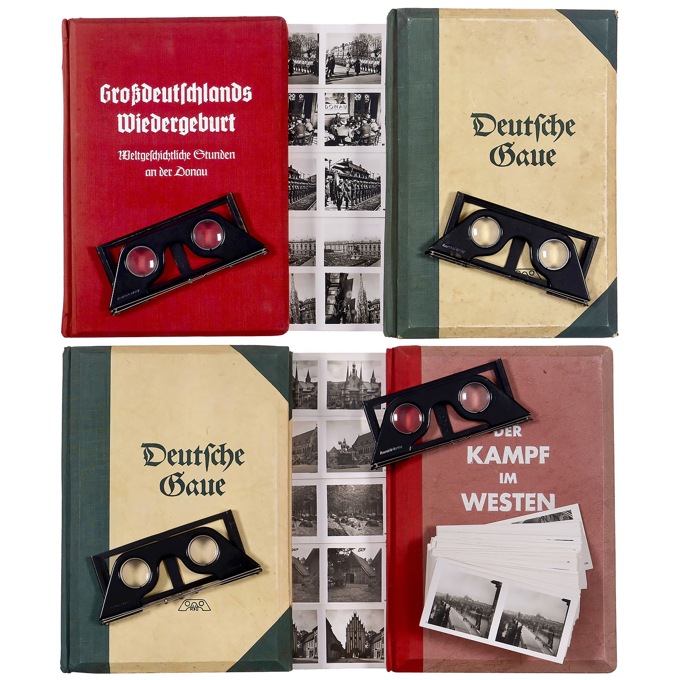 Raumbild-Verlag Otto Sch?nstein, Diessen/Ammersee. Stereo cards in 6 x 13 cm format, all well preserved, all albums with viewer. 1) "Gro?deutschlands Wieder?geburt" (Germany's Rebirth), 1938, text by Karl Bartz, with 100 Raumbild stereo cards by Heinrich Hoffmann, complete, 8 plates, red linen cover with embossing, 88 pages.