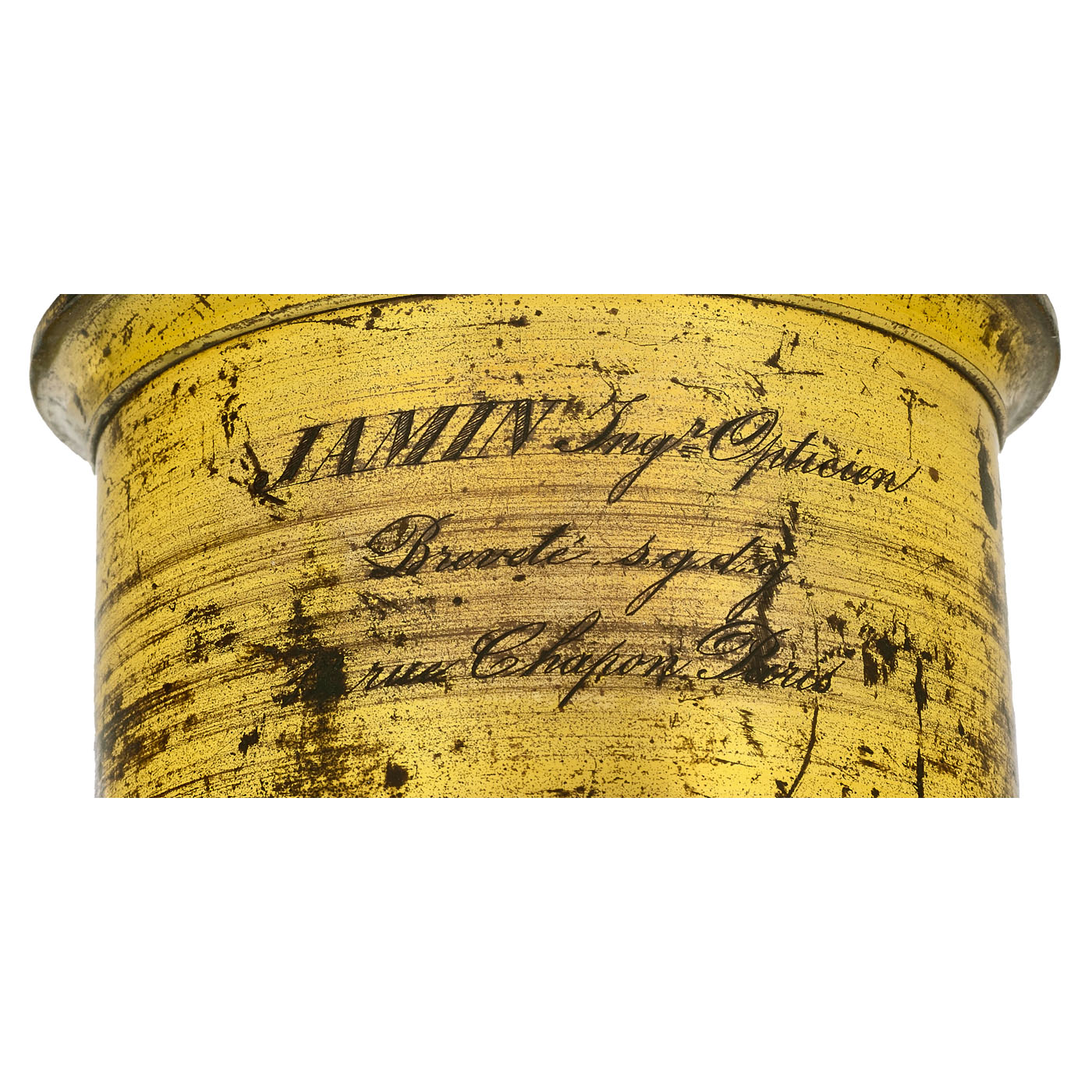 Jamin Ing. Opticien, Paris, rue Chapon 14. Brass mount is unnumbered, Petzval type with a front achromatic lens approx. 8.9 mm thick, focal length 4/32 cm, front and rear lenses (both screw-on) have the same diameter of 78 mm, not yet configured for plug-in apertures, focusing screw missing, but the tube slides smoothly, and the glass is clean under point light, height with sunshade 22.4 cm. Probably one of Jamin's last classic Petzval models before he decided to construct the Conus Centraliseur with a larger rear lens (and different specifications). A comparison of a later lens to a Conus lens would show why this idea was such a success. A very rare find.