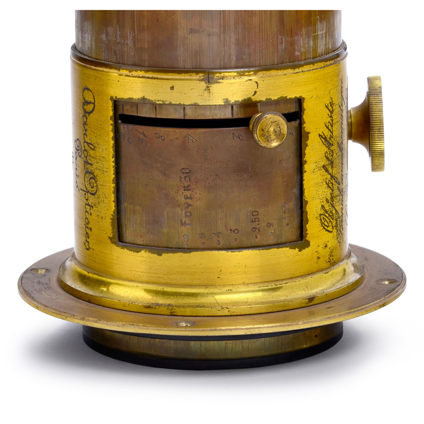 Darlot, Paris. No. 35734. Height approx. 16 cm, diameter of front element approx. 65 mm, with rack-and-pinion focusing (working) and iris stop. Equipped with two symmetrical menisci, altering the aperture setting produced the kind of artistic soft-focus effect popular during the so-called "Picturalist" period. Commander C. Puyo, one of the leading French picturalists, was involved in the design of this unusual lens. The example here uses iris stops, others were equipped with Waterhouse stop.