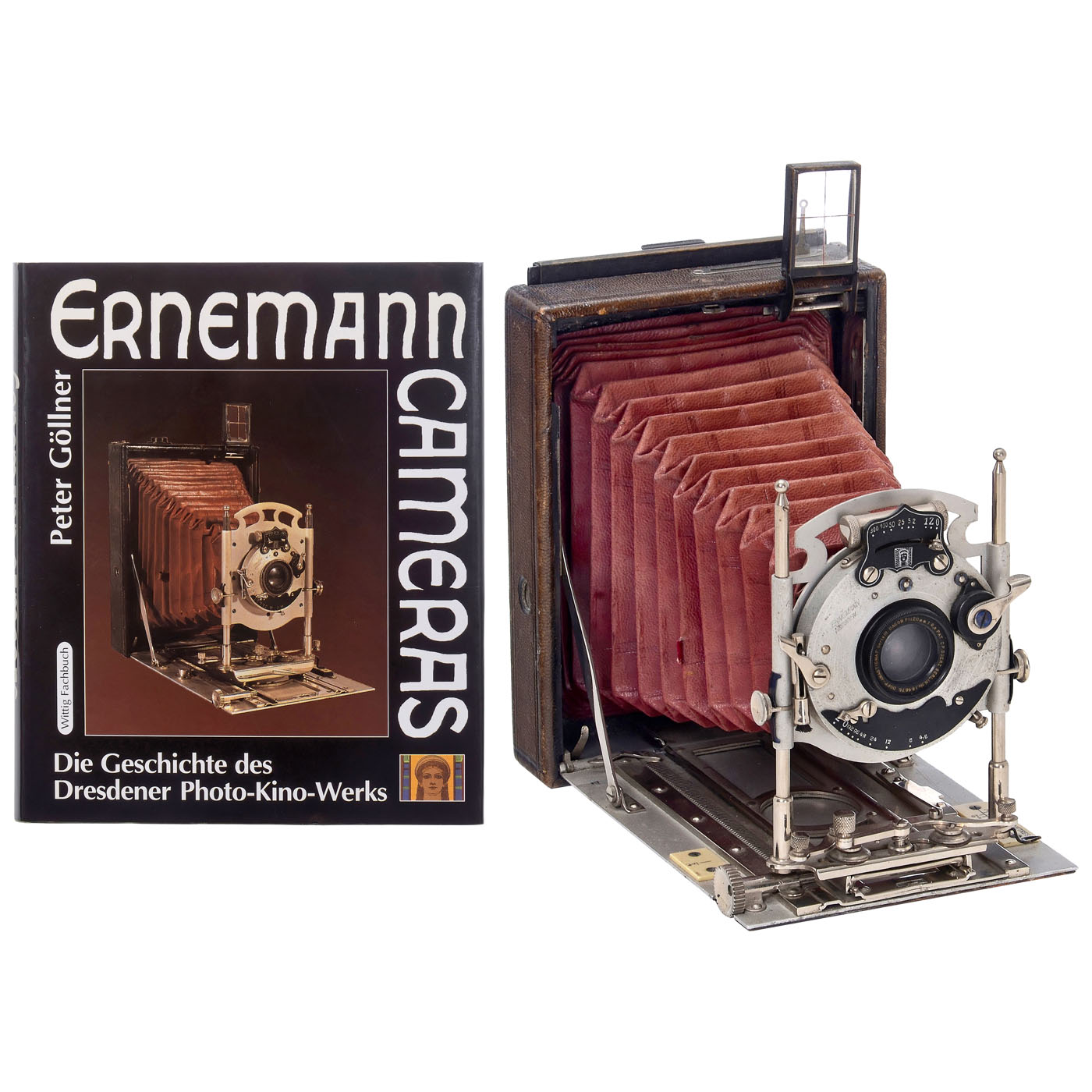 Ernemann AG in Dresden. 9 x 12 cm format, wooden case with black leather trim, aluminum floor mount, premium version with wine-red leather bellows, lens: Doppel-Anastigmat Series III Dagor 6.8/120 mm, pneumatic shutter speed 1