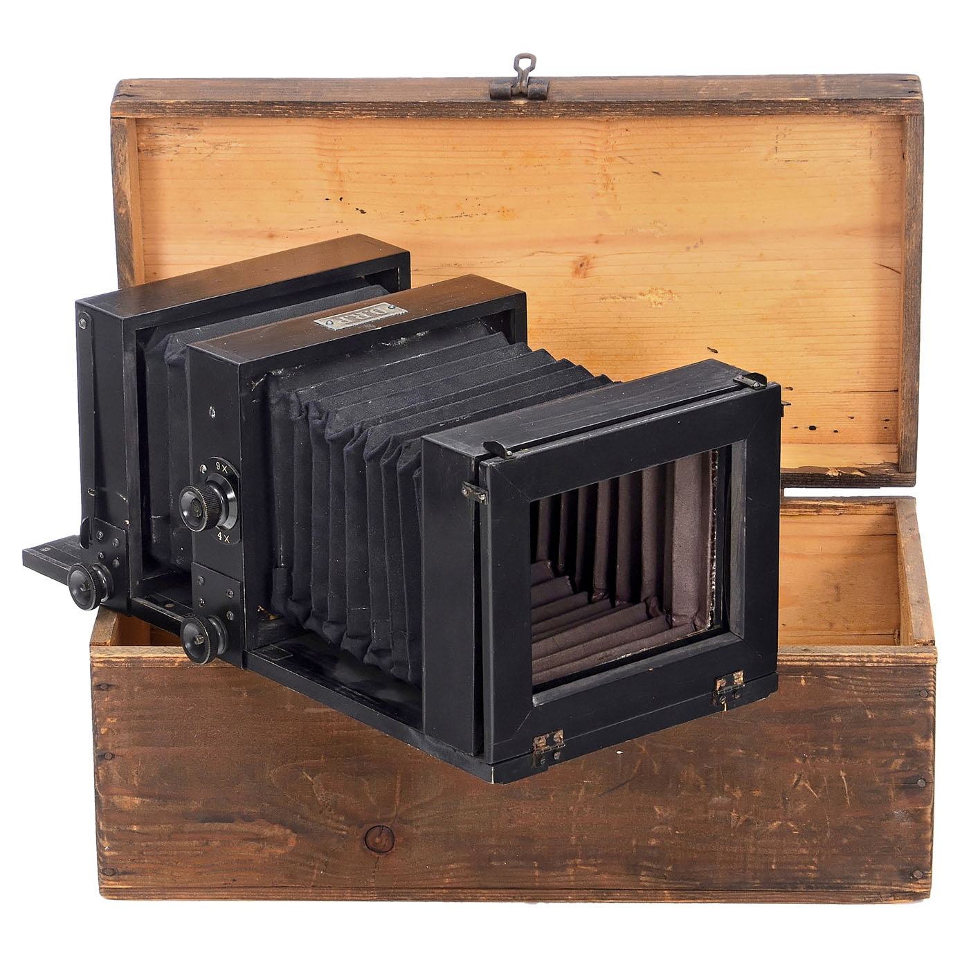 Franz Talbot, Berlin W. 15. Stamp camera for 4x or 9x reduction of a 9 x 12 cm negative to 9 x 12 cm paper photos for 4 or 9 postage stamp-sized partial images. Length 34 cm, movable center and rear lens sections, with large "D.R.P." label, without focusing screen, in good condition and with original box.